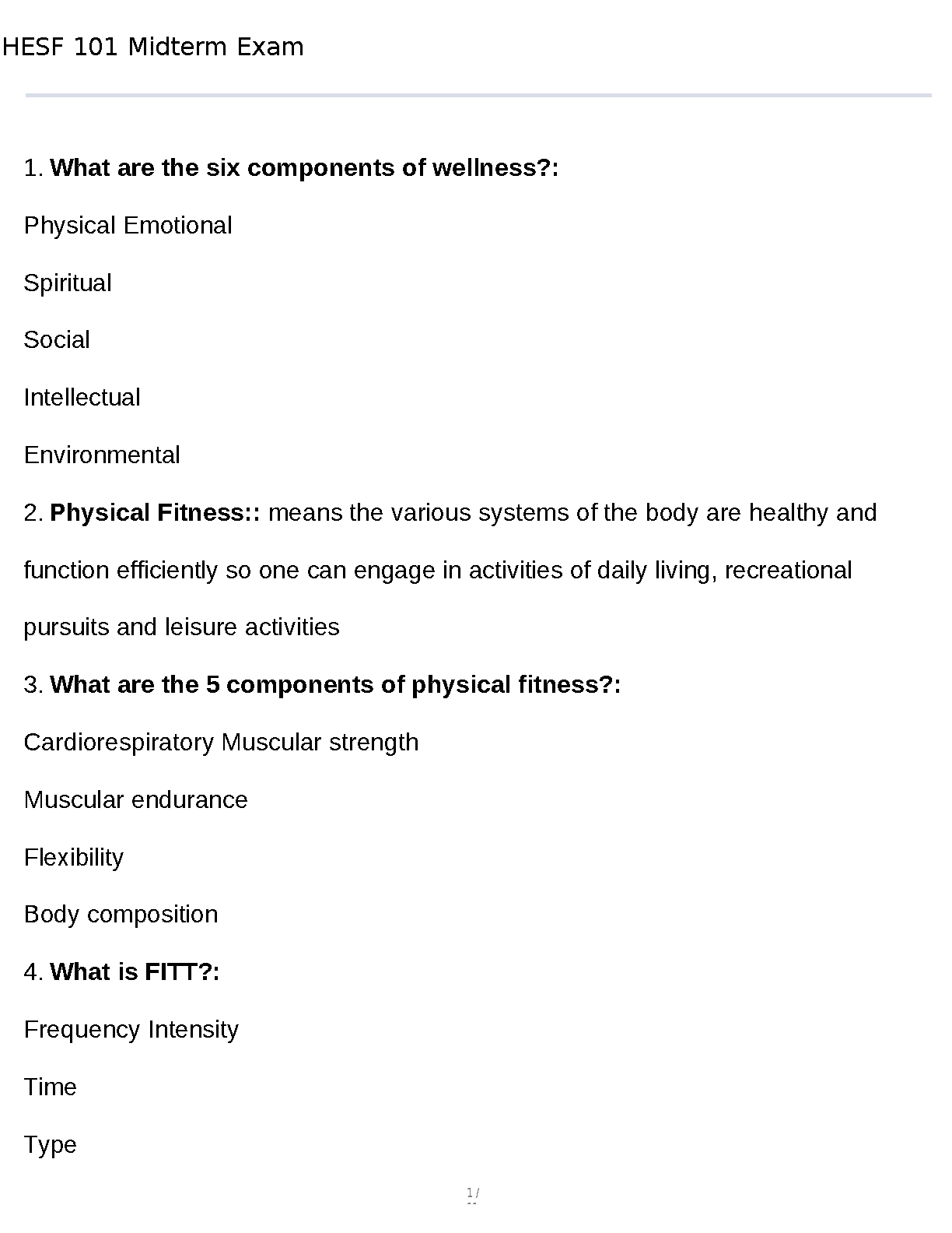 Master the HESF 101 midterm exam with this comprehensive study guide, designed to help students achieve exam success on their first attempt and avoid resits. This resource covers key concepts and provides valuable insights to help you understand the material completely. Prepare for questions about wellness components, physical fitness, and the FITT principle. Get ahead of the curve and boost your confidence!