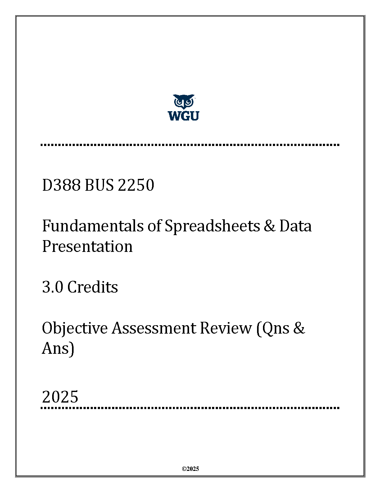 Ace your WGU D388 BUS 2250 exam with this comprehensive 2025 edition objective assessment review. This resource is designed to help students master the fundamentals of spreadsheets and data presentation, ensuring first-attempt success and avoiding costly resits. Prepare thoroughly and confidently for your exam.