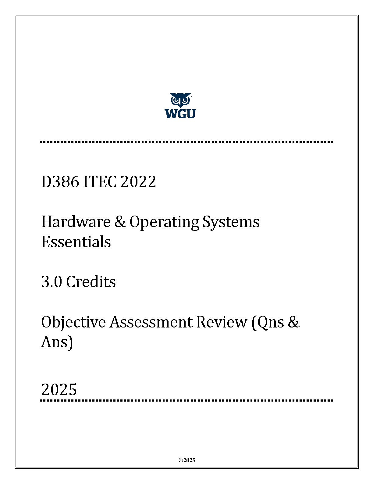 Ace your WGU D386 ITEC 2022 exam on your first attempt with this comprehensive objective assessment review. This resource contains questions and answers covering Hardware & Operating Systems Essentials, designed to help students avoid resits in the 2024/2025 academic year. Prepare effectively and confidently.