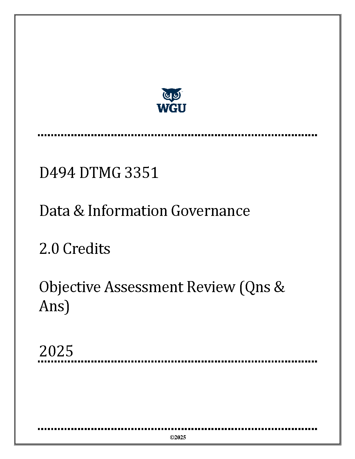Ace your WGU D494 DTMG 3351 Data & Information Governance exam on your first attempt with this comprehensive objective assessment review. This 2024-2025 resource provides questions and answers, ensuring exam readiness and maximizing your chances of success. Avoid resits and achieve academic excellence.