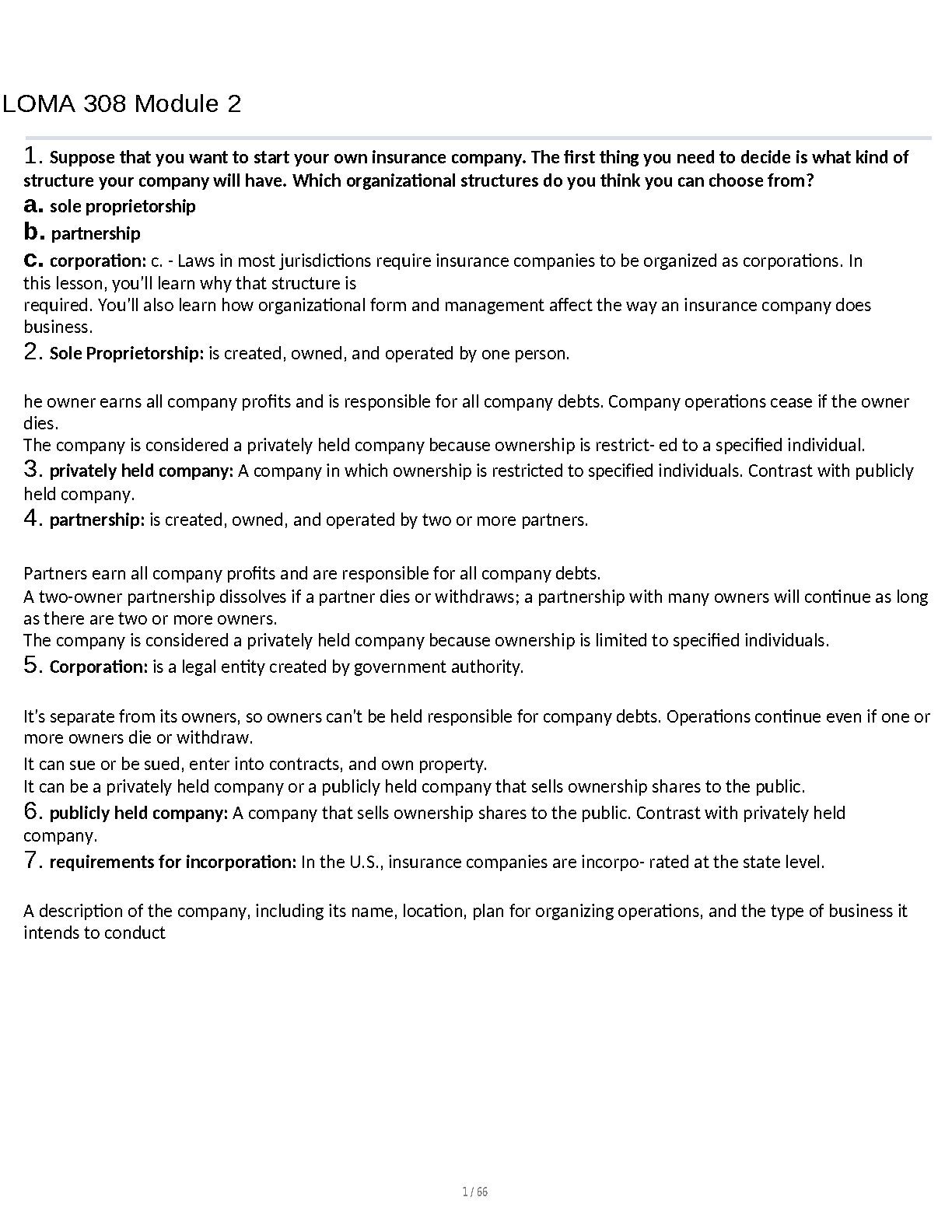 LOMA 308 Module 2: Understanding Business Structures for Insurance Companies