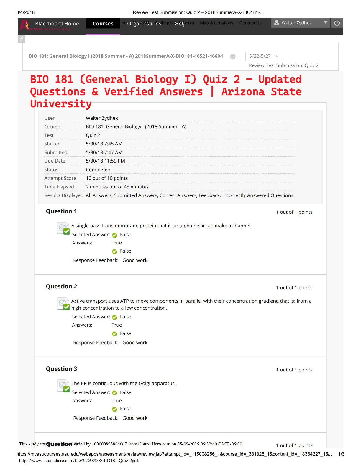 BIO 181 General Biology I Quiz 2 Updated Questions & Verified Answers | Arizona State University (2018 Summer Edition)