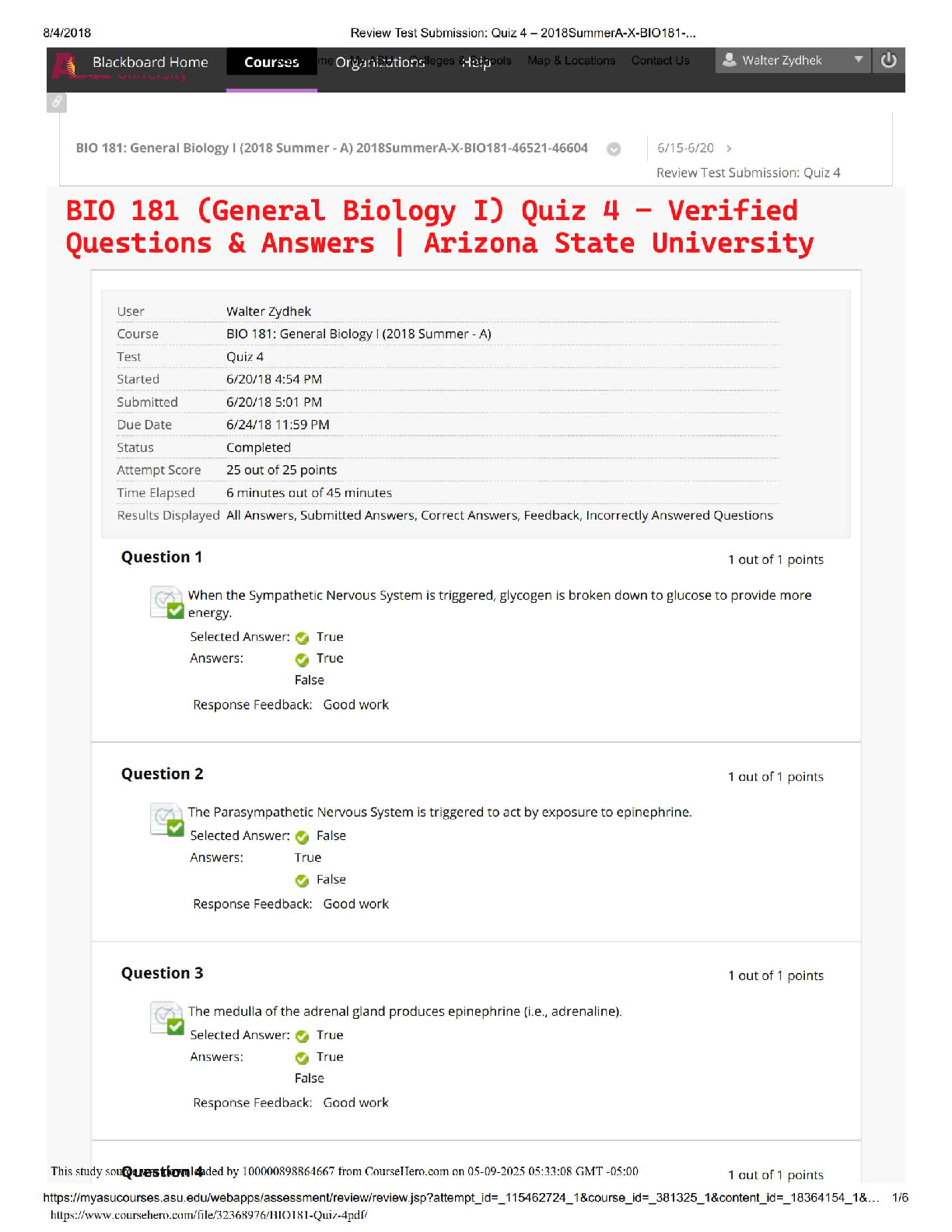 BIO 181 General Biology I Quiz 4 - Verified Questions & Answers (2018 Summer Edition) by Walter Zydhek