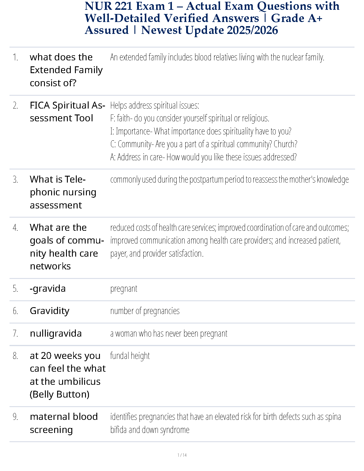 Ace your NUR 221 Exam 1 with this comprehensive study guide featuring well-detailed verified answers. This updated 2025/2026 edition guarantees exam success on your first attempt, helping you avoid resits. Perfect for students aiming for an A+.