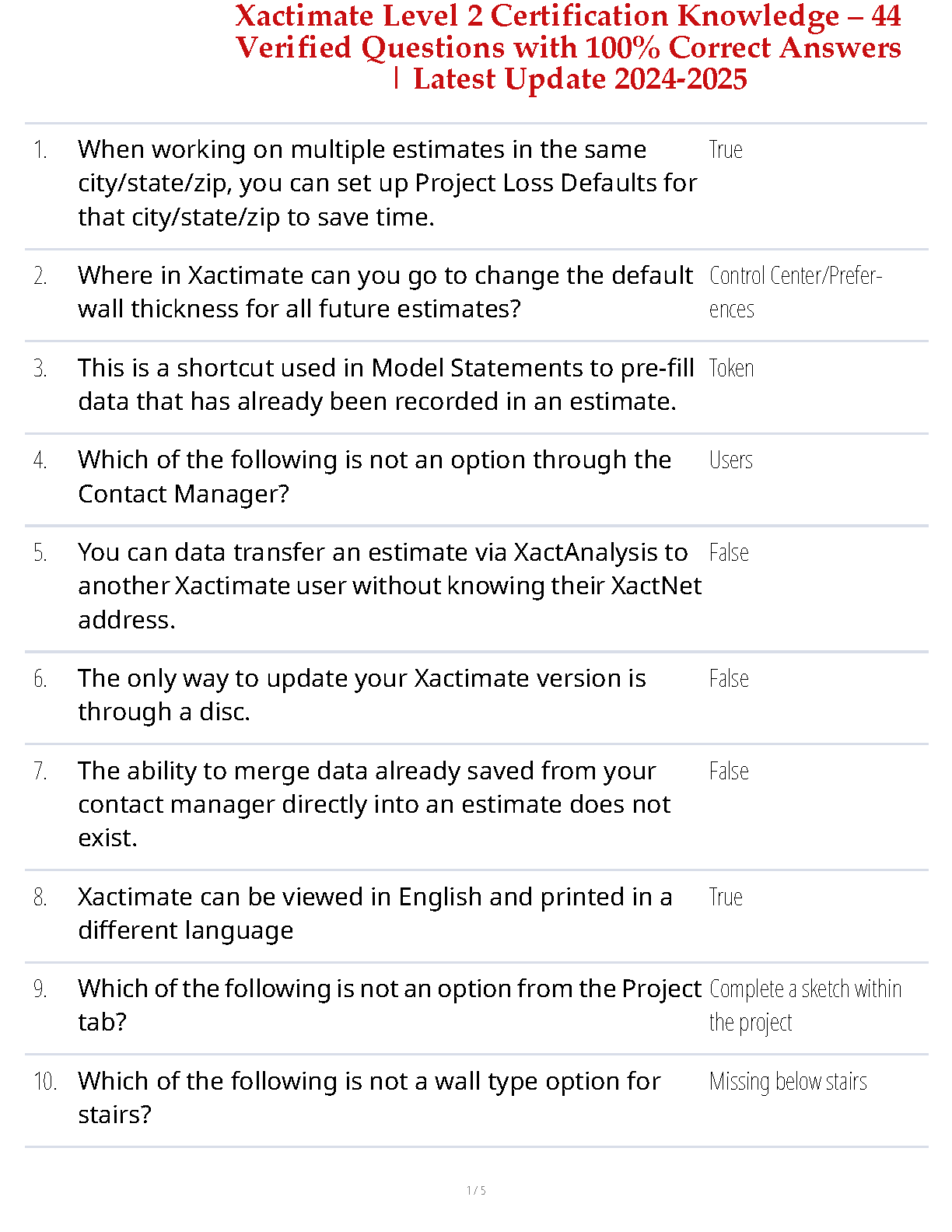 Xactimate Level 2 Certification Exam Prep 2024-2025: 44 Verified Questions with 100% Correct Answers