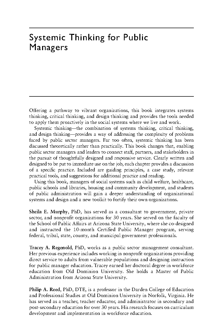 Systemic Thinking for Public Managers: Five Practices for Creating a Vibrant Organization (1st Edition) by Sheila E. Murphy, Tracey A. Regenold, and Philip A. Reed