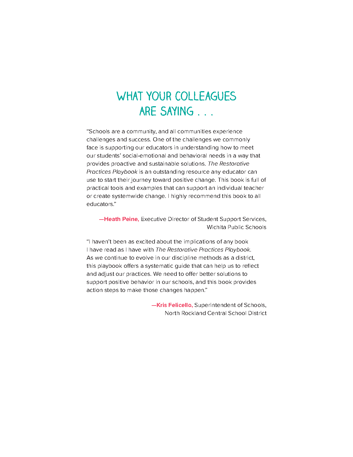 Unlock the secrets to creating a positive and productive school environment with "The Restorative Practices Playbook." This comprehensive guide, written by leading experts Dominique Smith, Douglas Fisher, and Nancy Frey, provides practical tools and strategies for transforming discipline in schools. Learn how to build strong relationships, address conflict effectively, and foster a sense of community among students and staff. Prepare for success in education and improve your classroom management skills. Perfect for educators seeking to enhance student well-being and academic achievement.