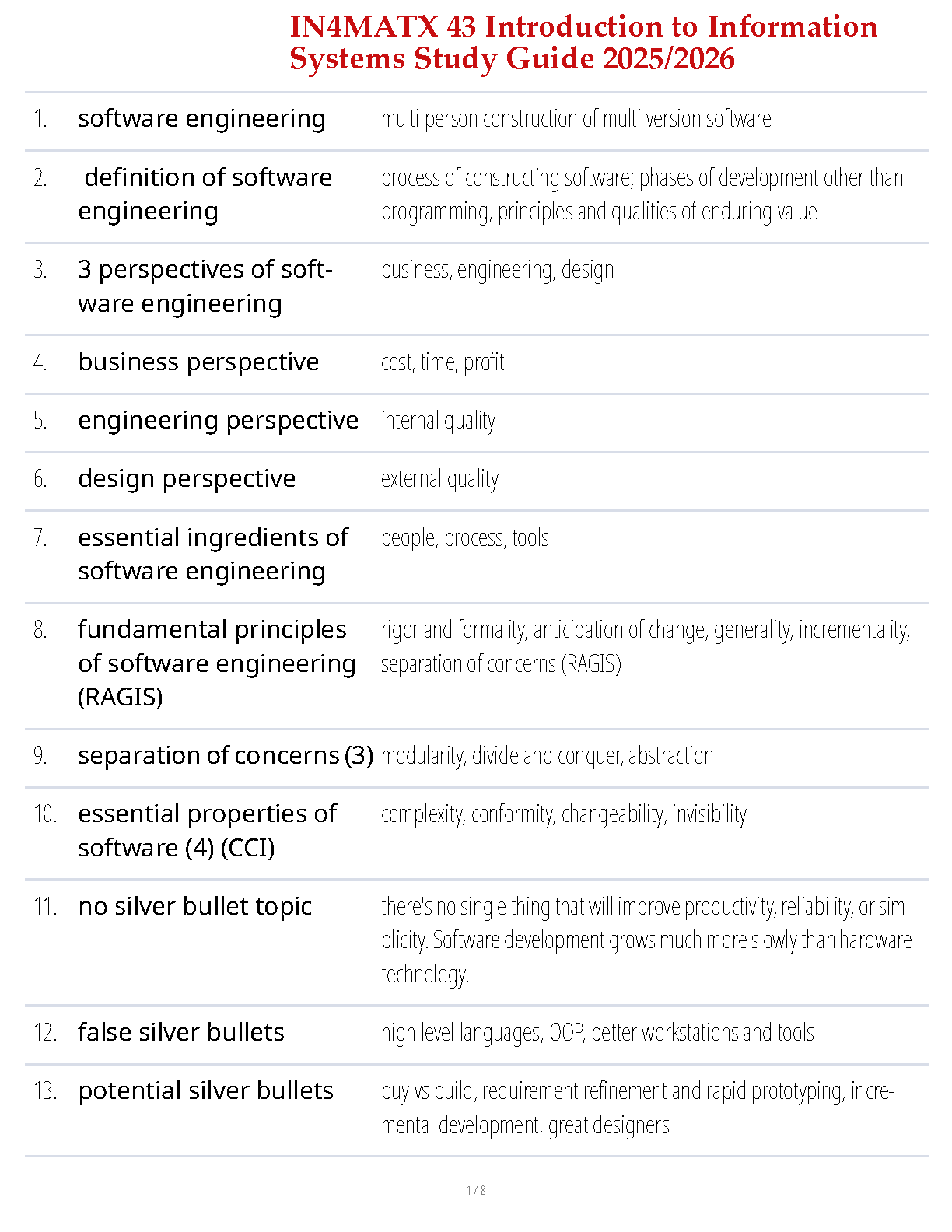 Master the concepts of software engineering with this meticulously crafted study guide for IN4MATX 43. Covering key topics such as software engineering definitions, perspectives, essential ingredients, principles, and the 'no silver bullet' concept, this resource will help you excel in your exams. Prepare effectively and avoid resits with this 2025/2026 edition.