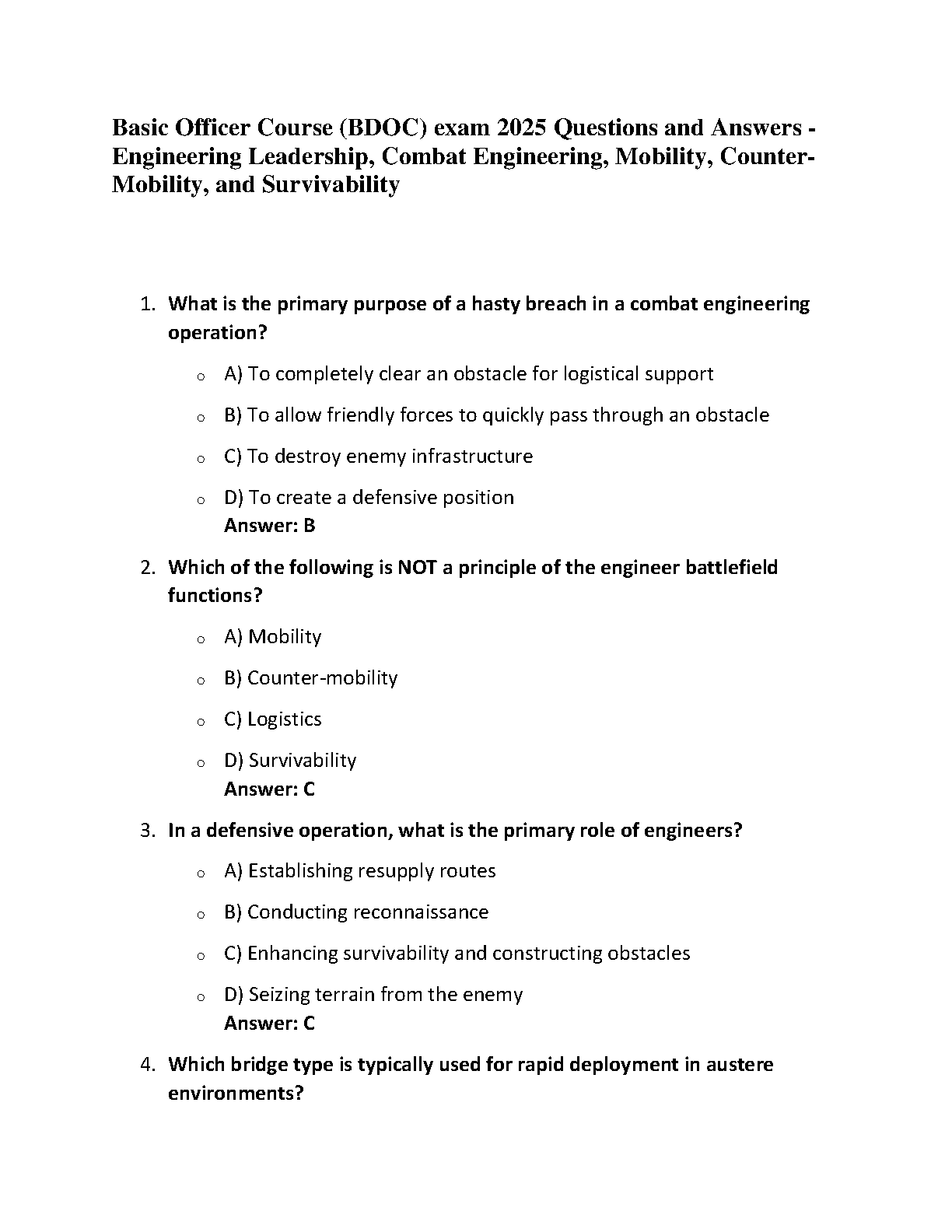 Ace your 2025 Basic Officer Course (BDOC) exam on your first attempt with this comprehensive question and answer resource. Covering key areas like engineering leadership, combat engineering, mobility, counter-mobility, and survivability, this guide is designed to help you avoid resits and achieve exam success.