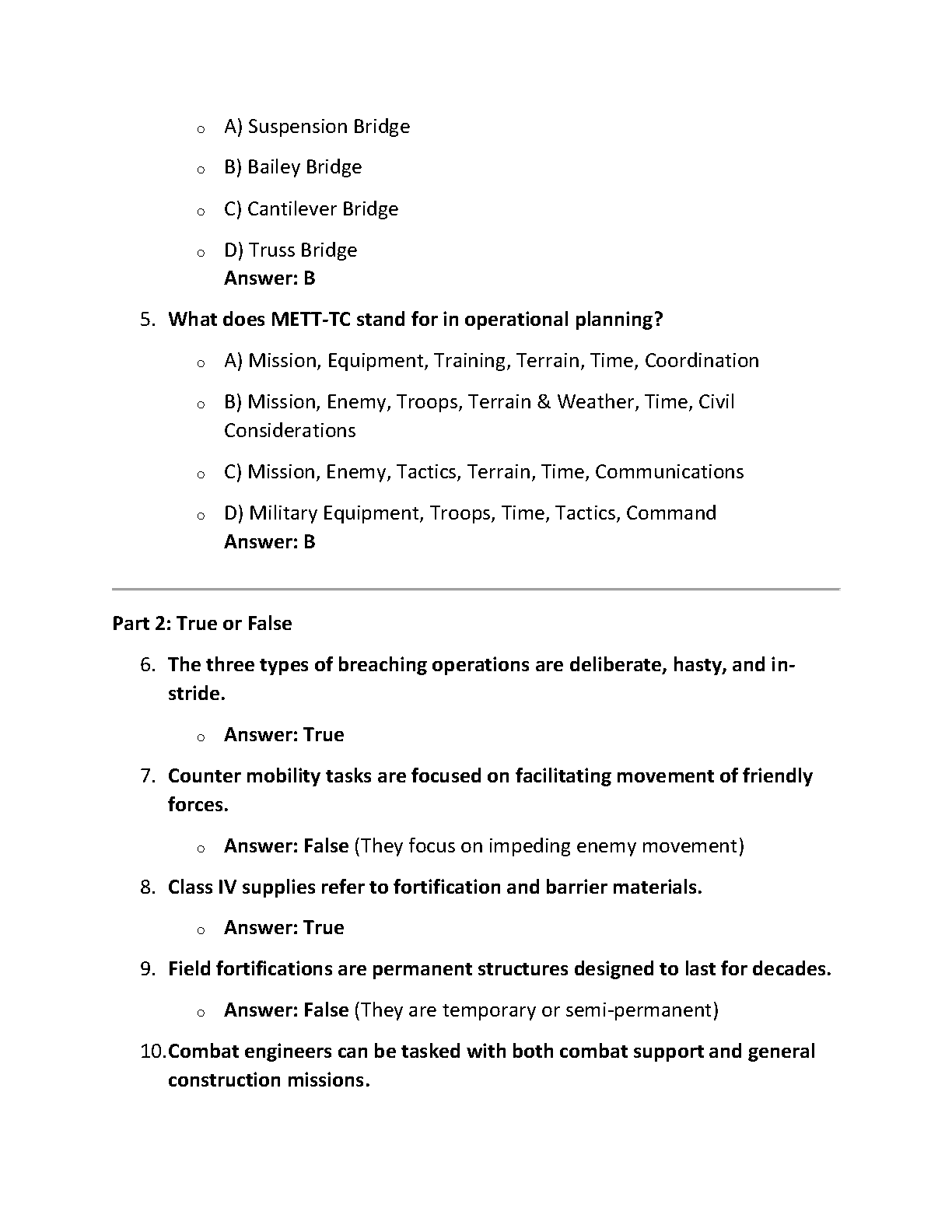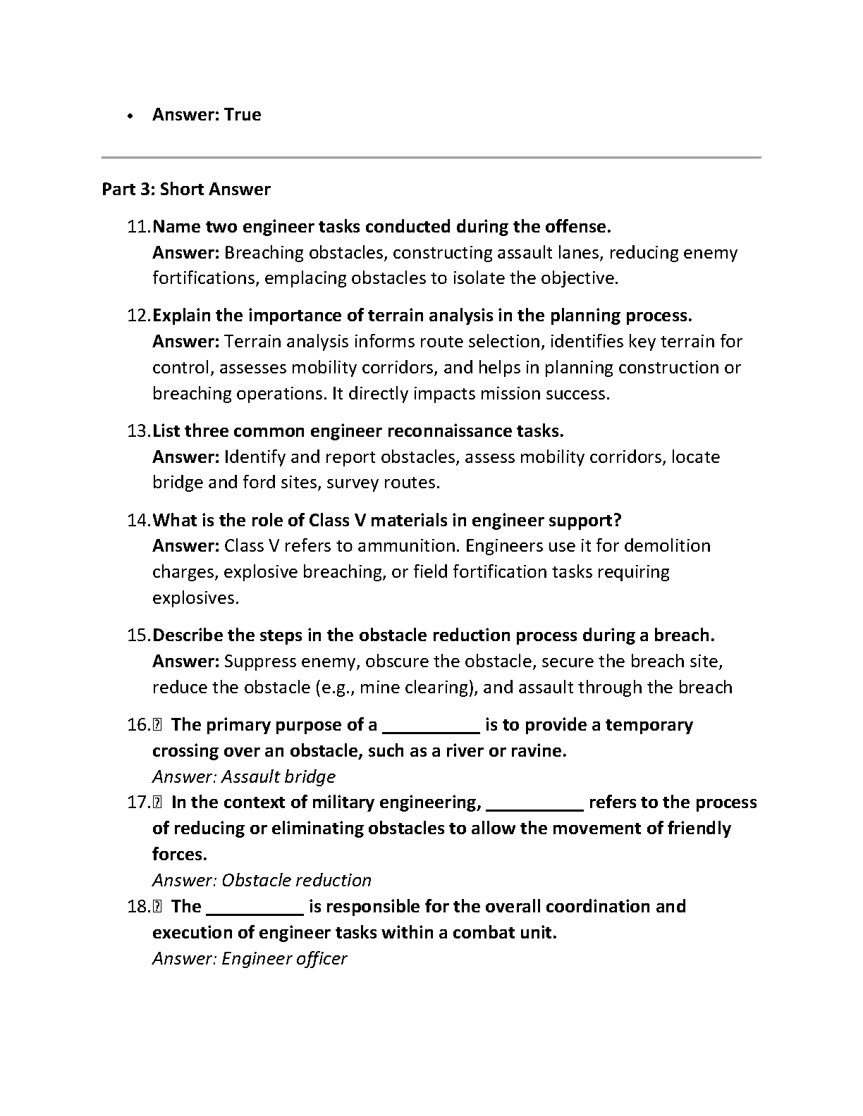 2025 Basic Officer Course (BDOC) Exam Questions and Answers: Engineering Leadership, Combat Engineering, Mobility, and Survivability