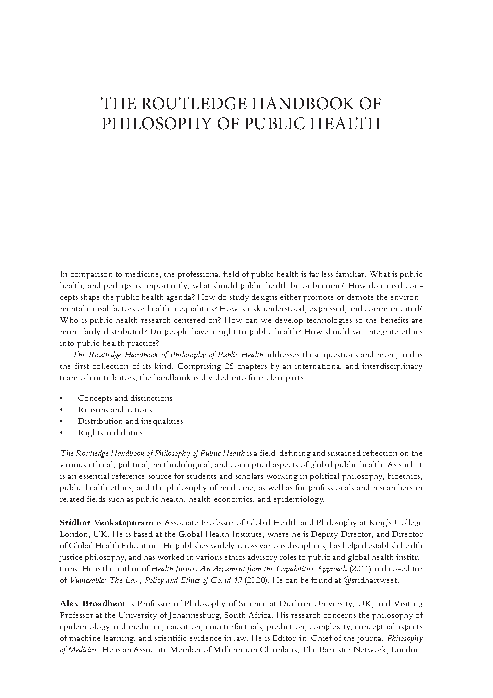 The Routledge Handbook of Philosophy of Public Health (1st Edition) by Sridhar Venkatapuram and Alex Broadbent