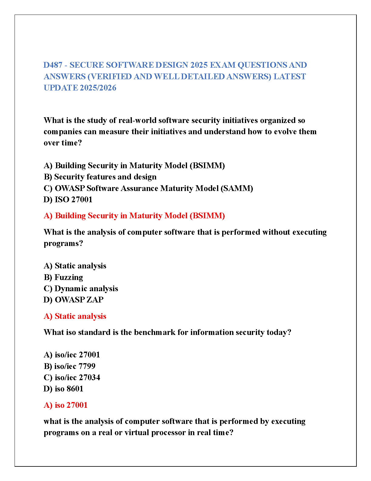 D487 Secure Software Design 2025 Exam Questions and Answers (Verified and Well-Detailed Answers) - Latest Update 2025/2026