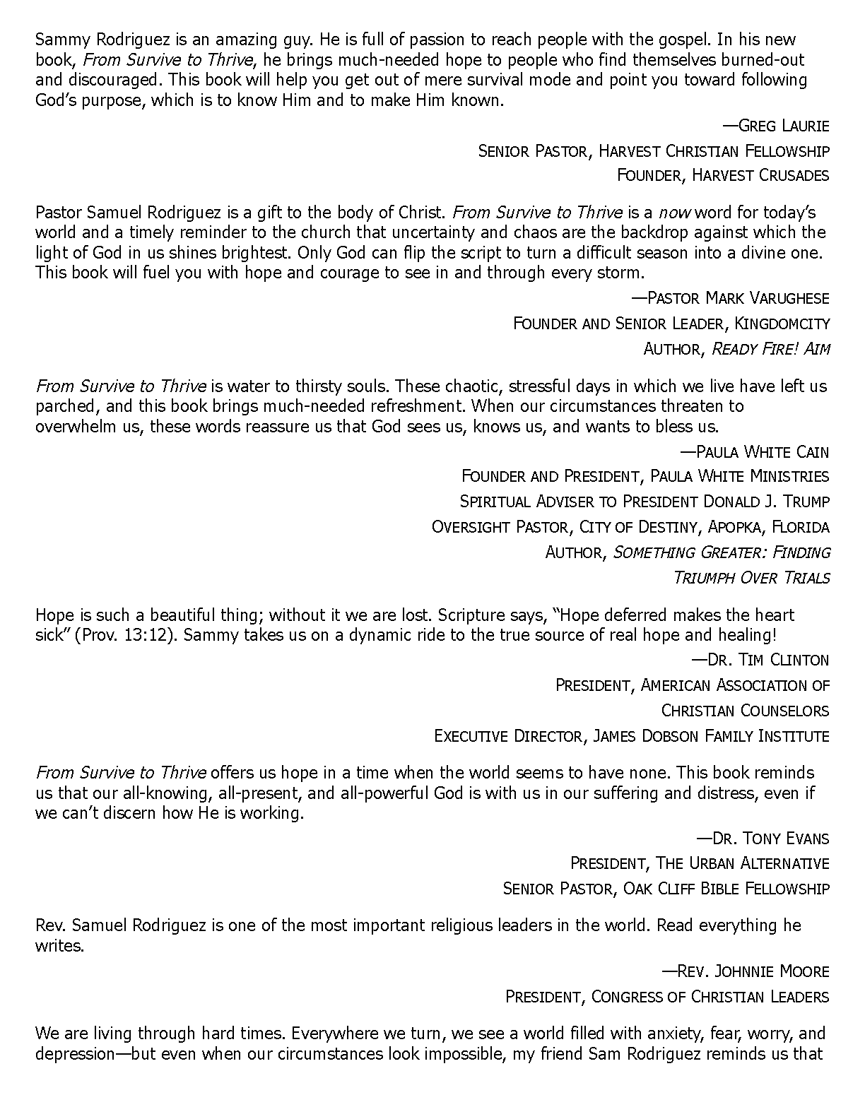 Gain insights into living a fulfilling life with Samuel Rodriguez's 'From Survive to Thrive.' This guide offers practical strategies for achieving a holy, healed, healthy, happy, humble, hungry, and honoring life. Discover ways to overcome challenges and thrive in all aspects of your life.