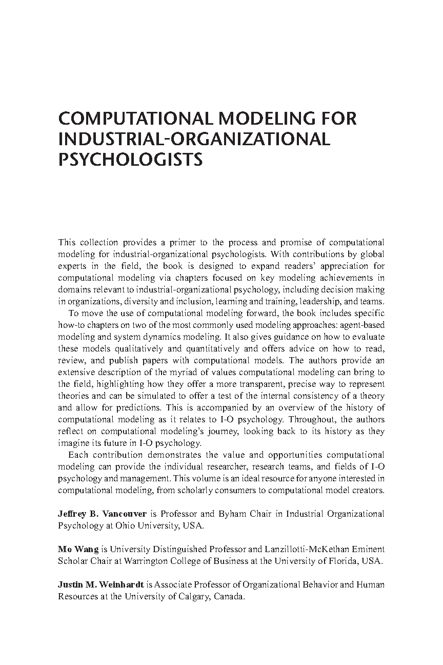 Computational Modeling for Industrial-Organizational Psychologists: 1st Edition by Jeffrey B. Vancouver, Mo Wang, and Justin M. Weinhardt
