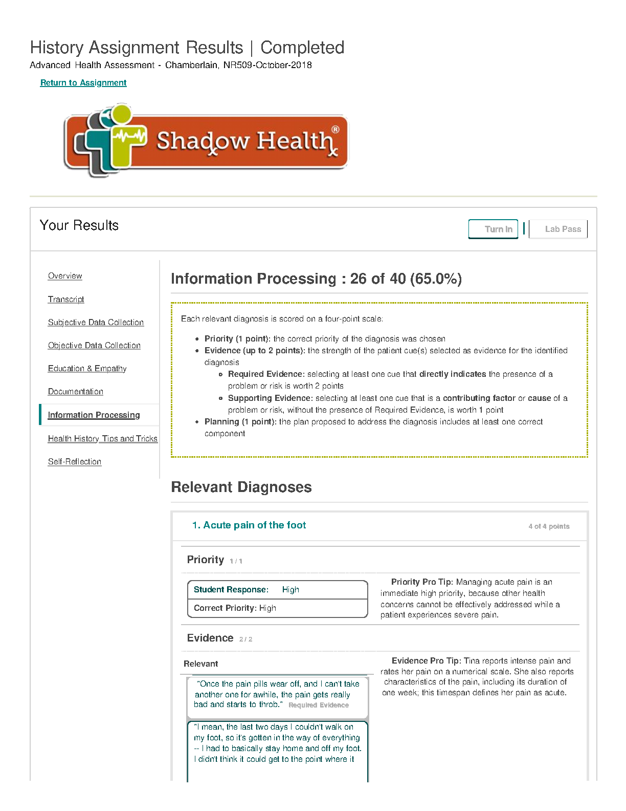 NR509 History Assignment Results. Completed Advanced Health Assessment. Chamberlain 2023
