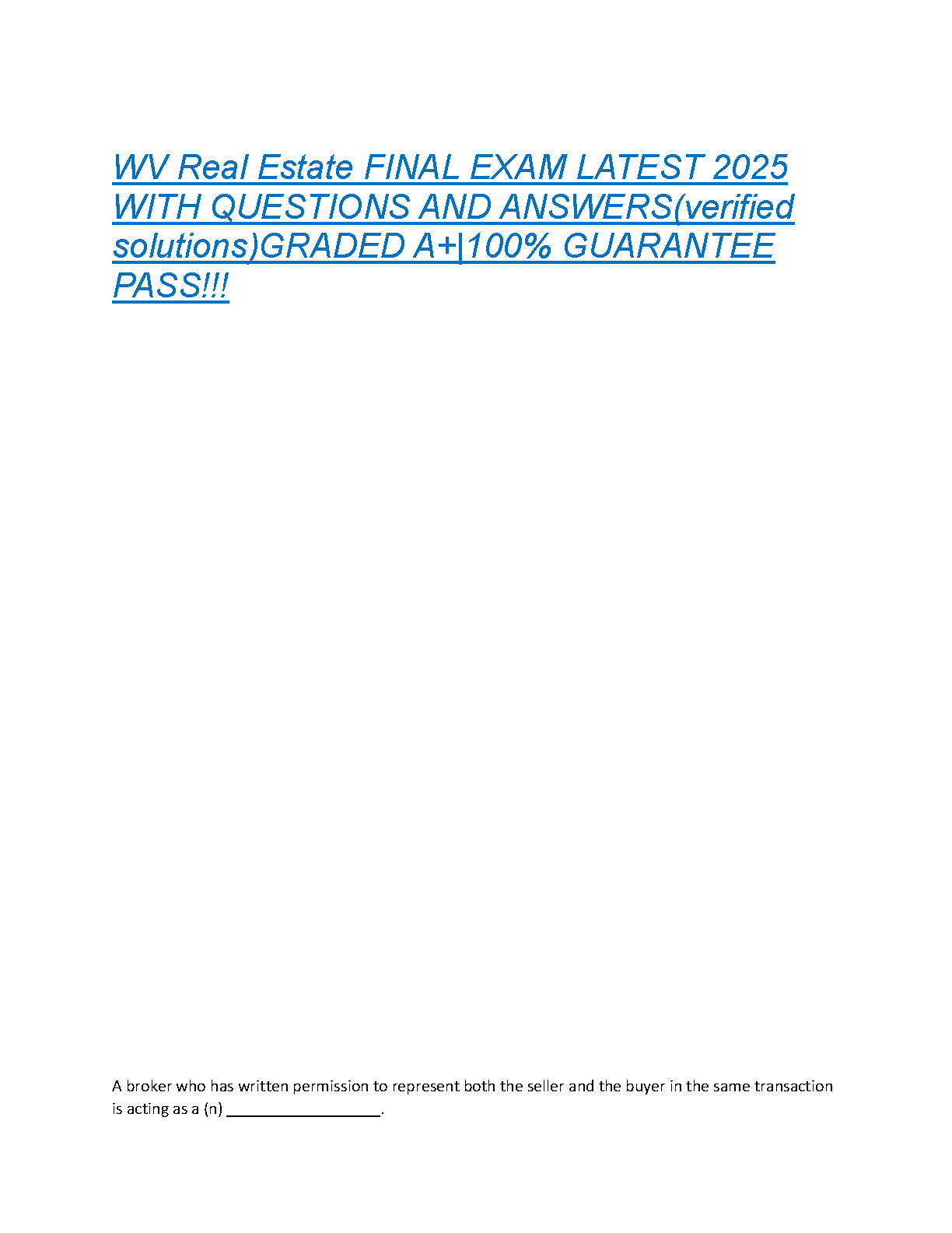 Pass your WV Real Estate final exam with flying colors! This comprehensive study guide contains verified questions and answers for the 2025 edition, guaranteeing an A+ and ensuring a first-time pass. No more resits! Perfect for students aiming for exam success.
