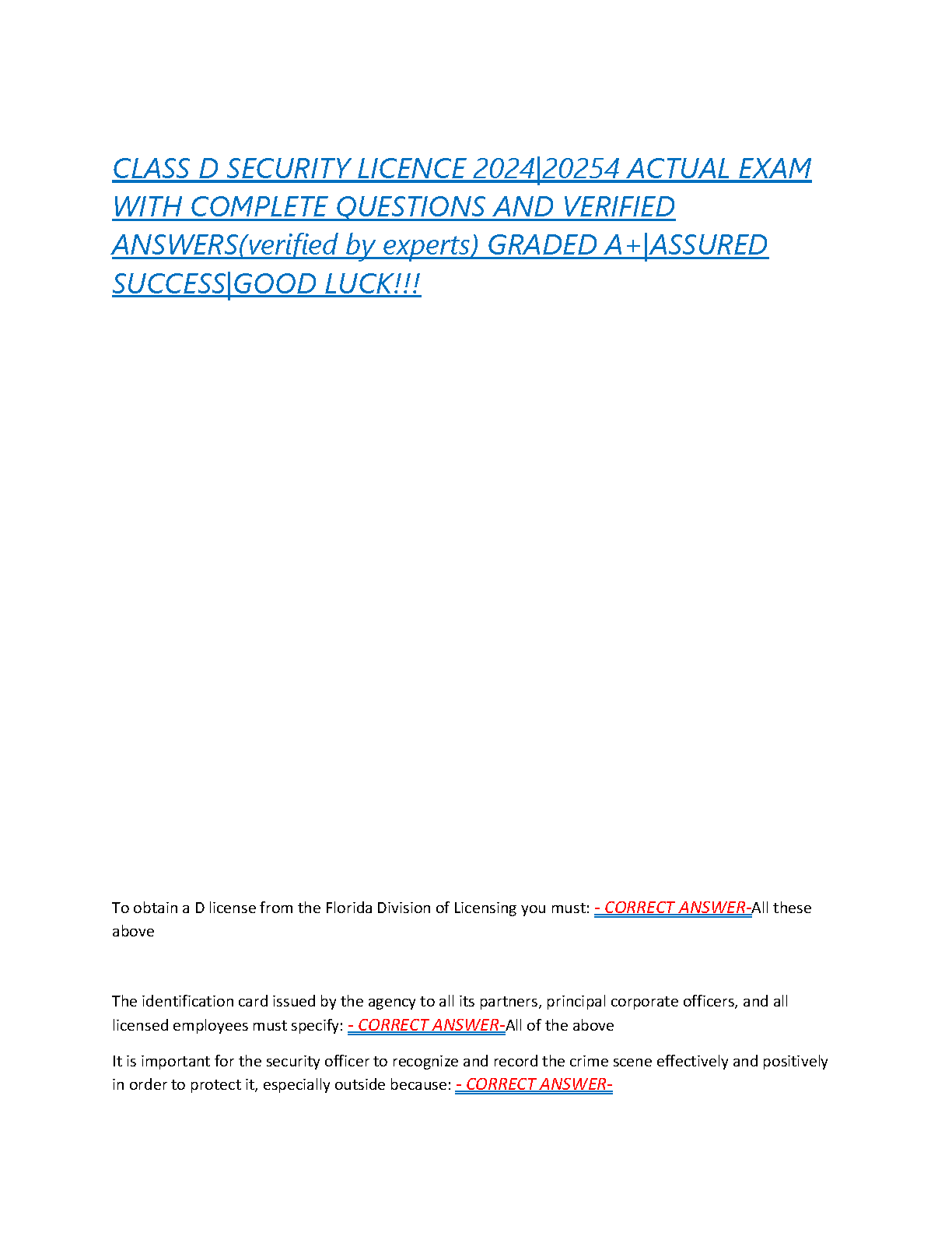 Ace your 2024/2025 Class D Security License exam on your first try with this comprehensive study guide. Includes verified answers and expert explanations to help you achieve a perfect score and avoid resits. Get the edge you need for success!