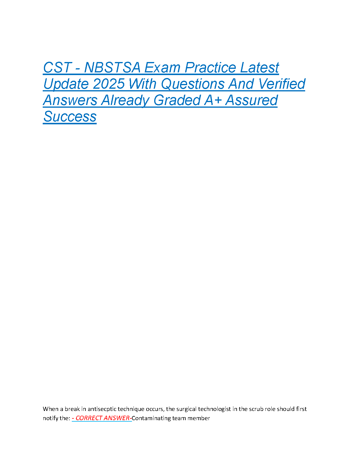 Ace your 2025 CST - NBSTSA exam on the first try with this comprehensive practice resource. Includes updated questions and verified answers, ensuring you're fully prepared for exam day. Guaranteed A+ success!