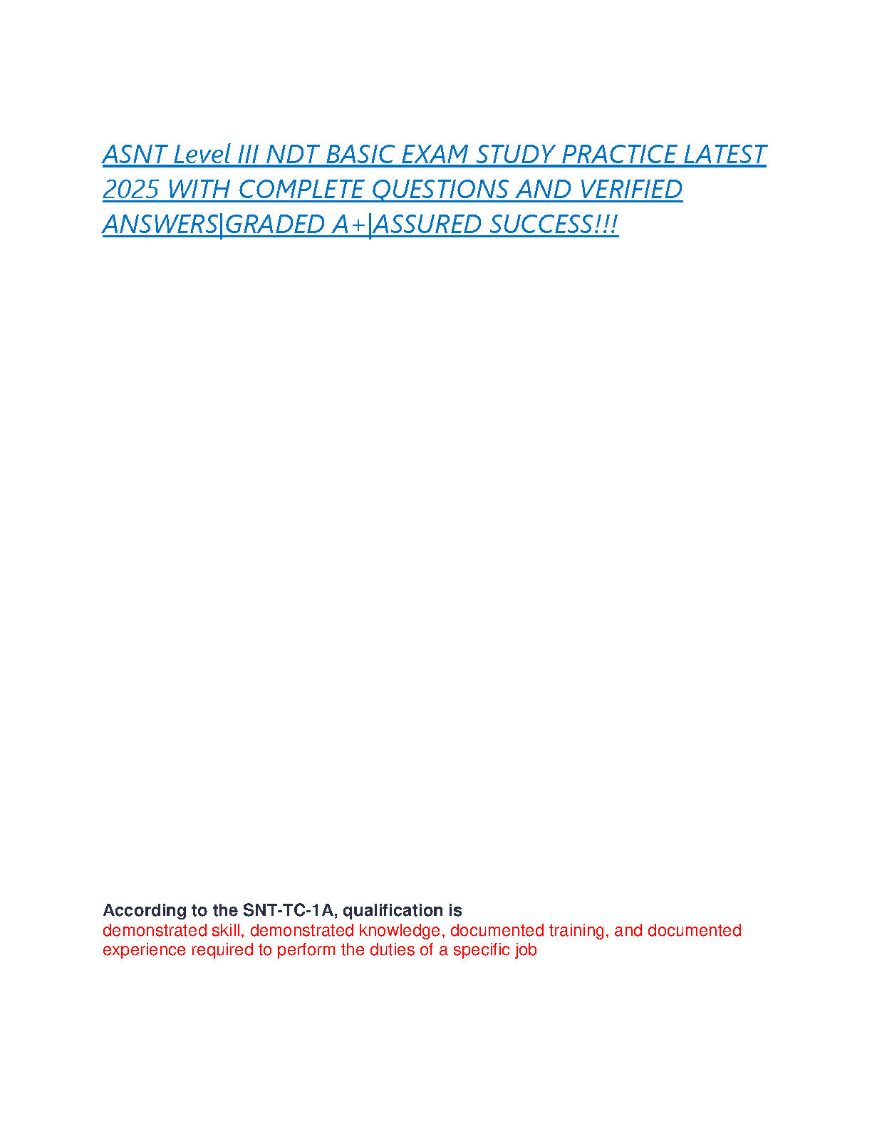 Ace your ASNT Level III NDT Basic exam with this comprehensive 2025 study guide. This resource features complete questions and verified answers, designed to ensure a perfect score and avoid resits. Prepare effectively and confidently for your exam, achieving A+ results and guaranteed success!