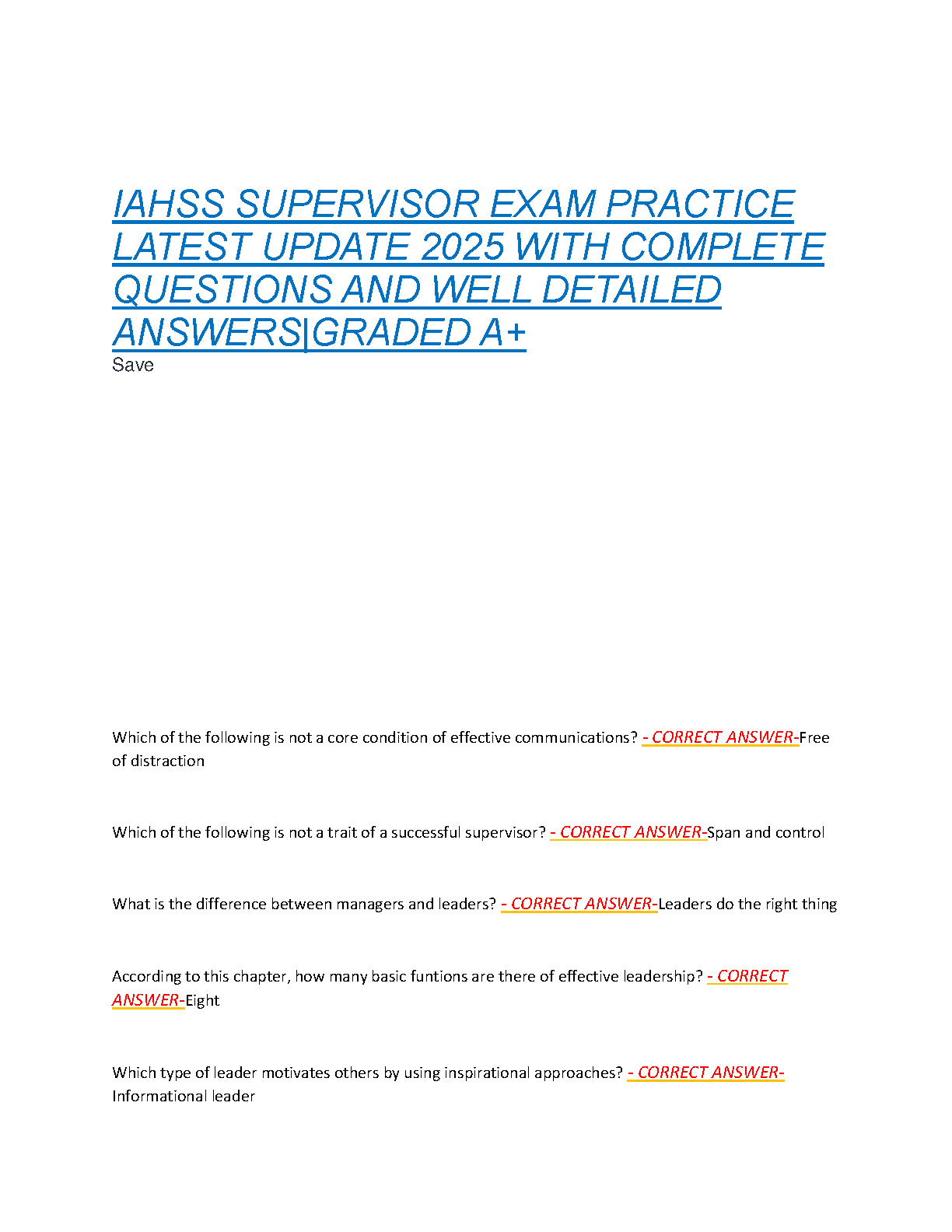 Ace your IAHSS Supervisor exam on the first attempt with this comprehensive 2025 edition practice test. Includes complete, well-detailed answers graded A+, ensuring thorough exam preparation and avoiding resits. Get the edge you need for success!