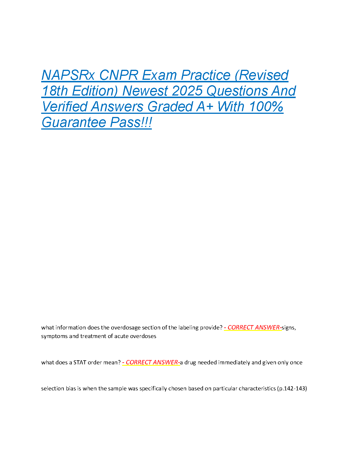 NAPSRx CNPR Exam Practice (18th Edition) by Unknown Authors: 2024-2025 Newest Questions & Verified Answers for a Guaranteed A+
