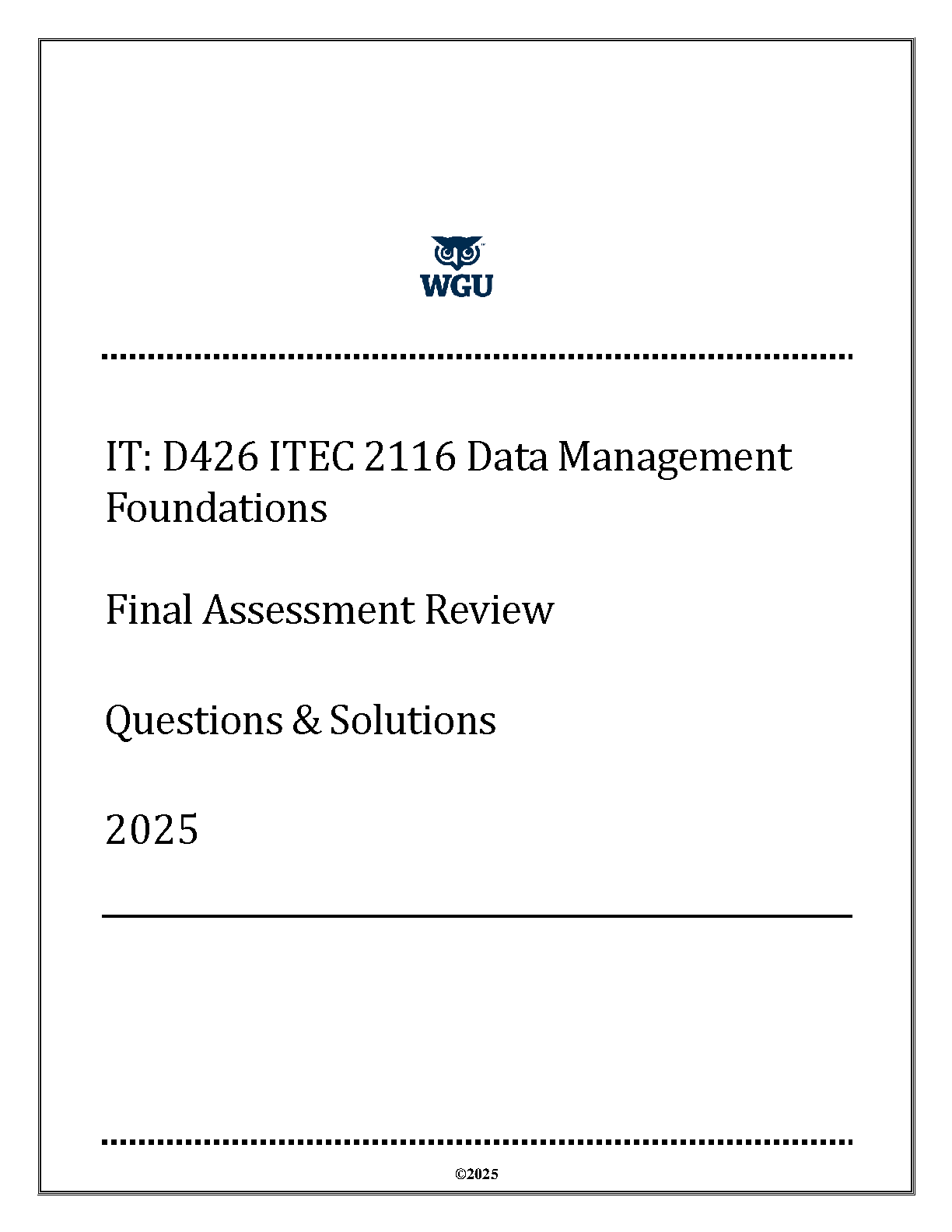 Ace your WGU IT: D426 ITEC 2116 Data Management Foundations final assessment with this comprehensive review guide. This resource includes questions and solutions designed to help students pass their exams on the first attempt. Prepared for the 2024/2025 academic year.