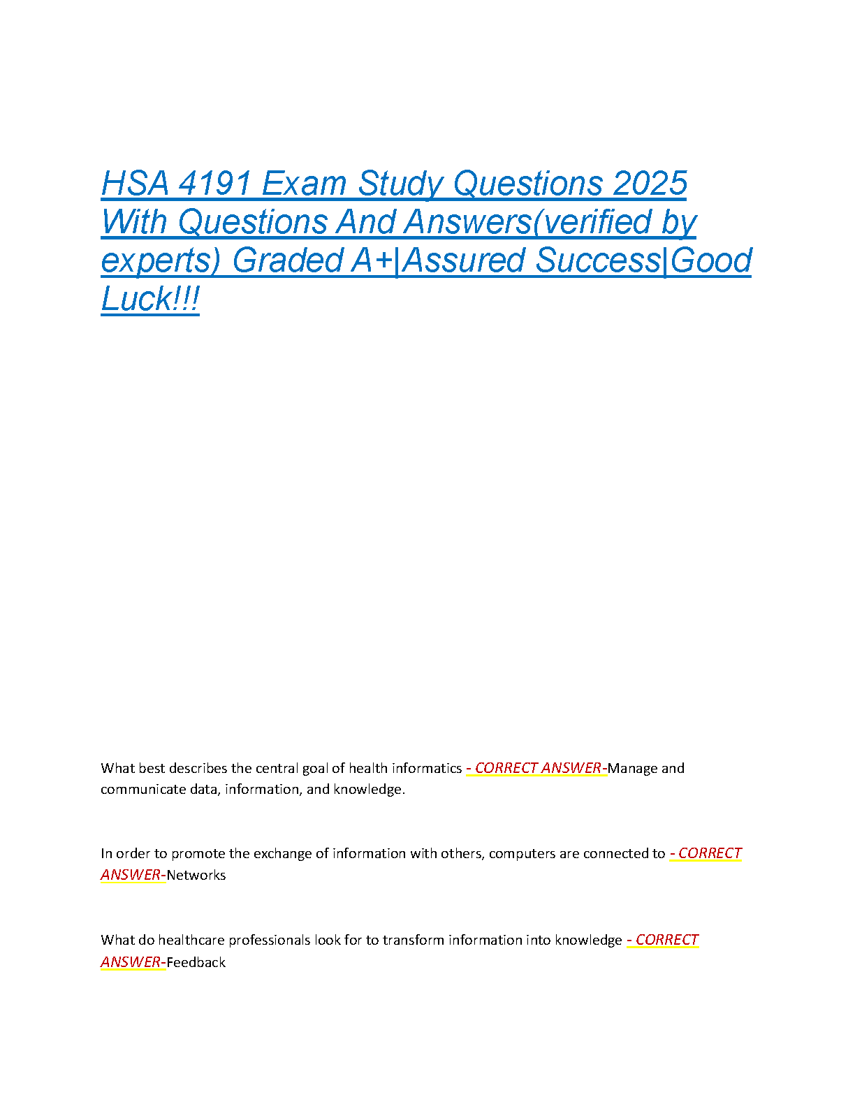Ace your HSA 4191 exam with this comprehensive study guide. This resource contains verified questions and answers prepared by experts, ensuring you're well-prepared for exam success on your first attempt. Get the A+ you deserve and avoid resits!