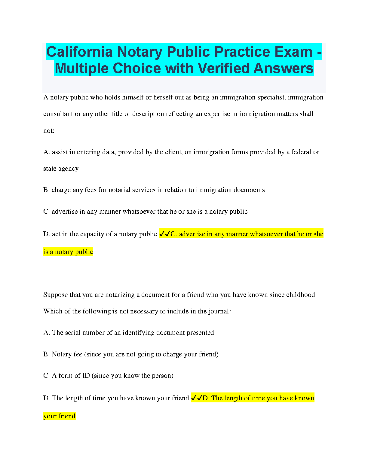 Prepare for your California Notary Public exam with confidence! This comprehensive practice exam features multiple-choice questions with verified answers, covering essential topics to help you pass on your first attempt. Ace your exam and avoid resits with this invaluable resource.