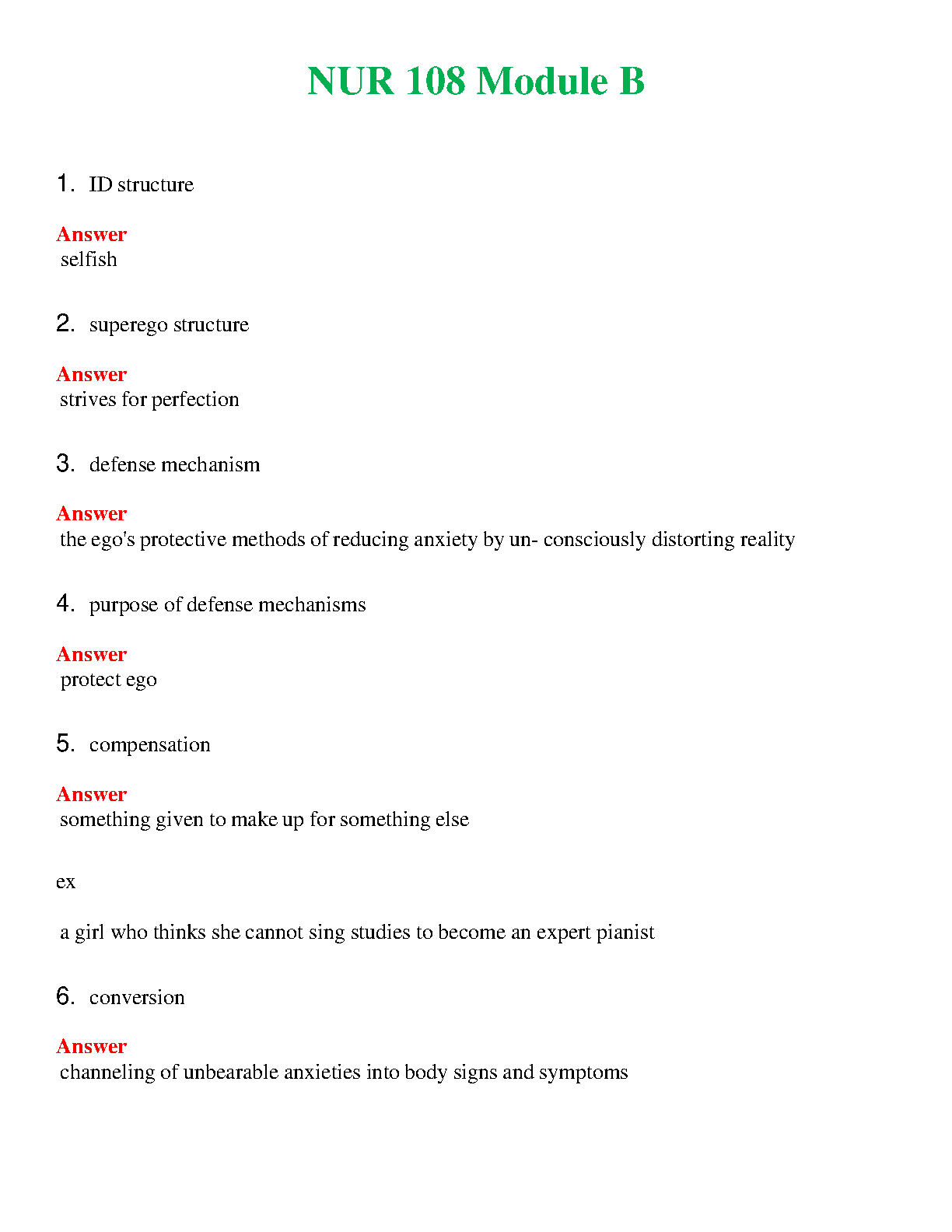 Ace your NUR 108 exam with this comprehensive guide to defense mechanisms, ID, ego, and superego structures. Understand the concepts of compensation and conversion, and learn how to apply your knowledge to real-world scenarios. This resource ensures first-attempt success, avoiding exam resits.