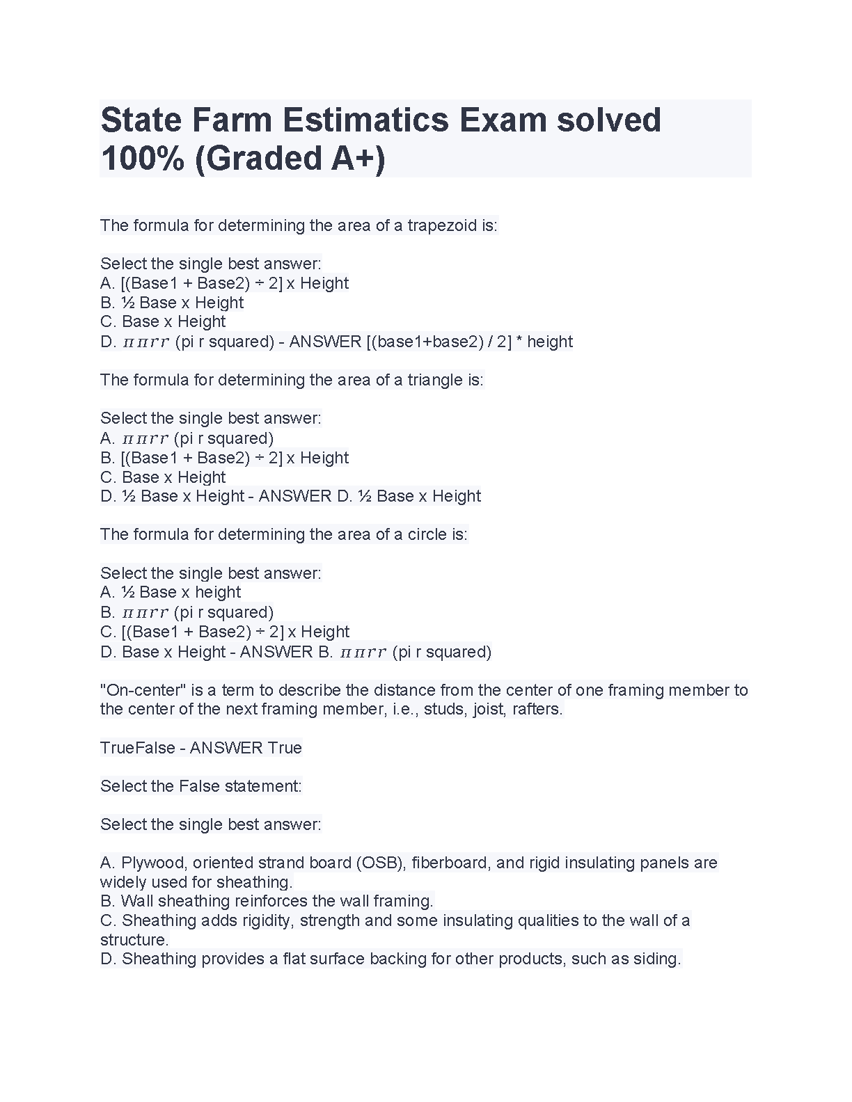 Ace your State Farm Estimatics exam with this comprehensive solution guide. This 100% accurate, A+ graded resource covers key concepts including area calculations for trapezoids, triangles, and circles, and provides detailed explanations for each problem. Prepare for exam success and avoid resits with this essential study material.