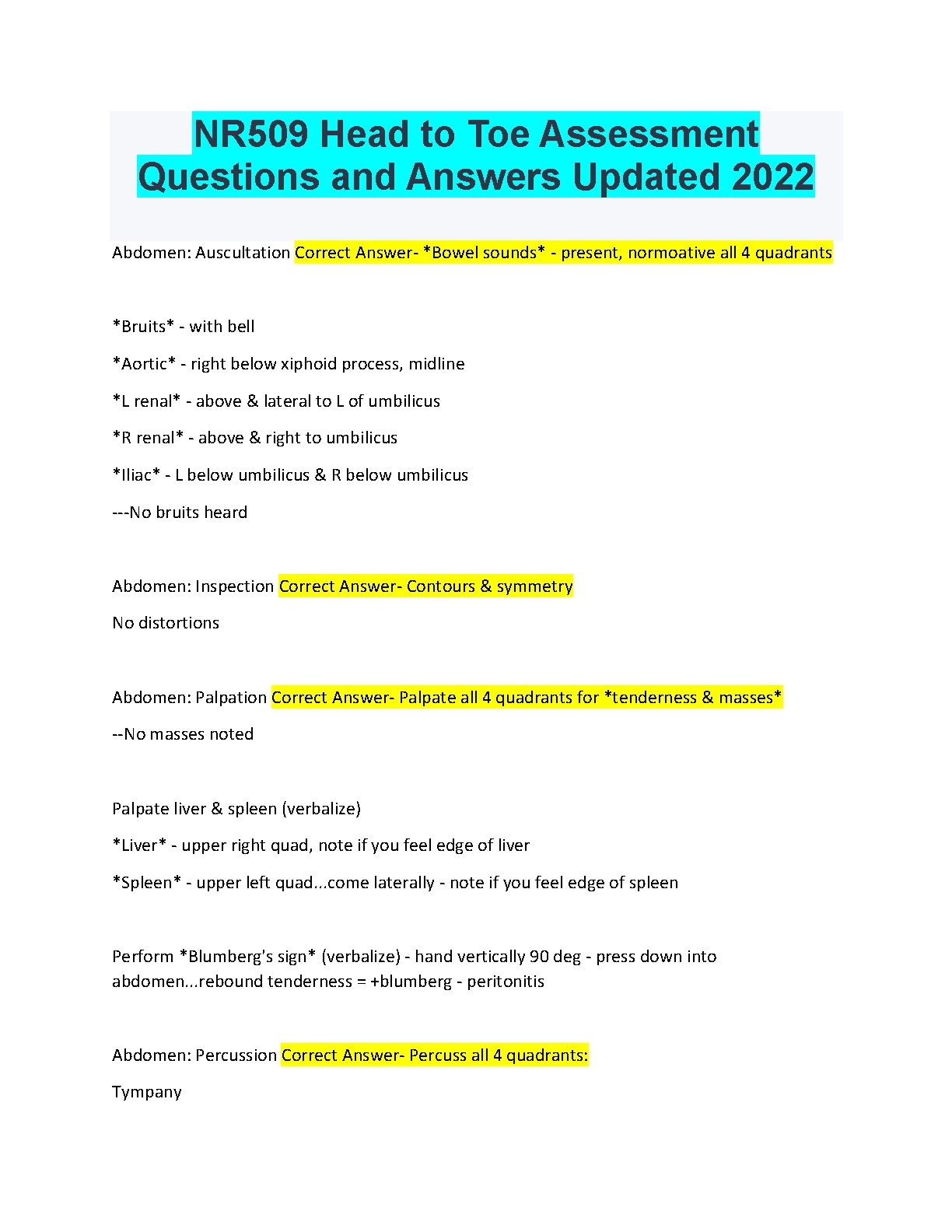 NR509 Head to Toe Assessment Questions and Answers Updated 2022: A Comprehensive Guide for Nursing Students