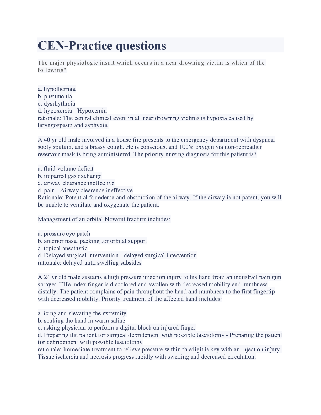 Ace your CEN exam on the first try with these comprehensive practice questions covering key concepts in emergency nursing. These questions are designed to help you identify areas for improvement and build confidence before test day. Topics include near-drowning victims, house fire injuries, orbital blowout fractures, and high-pressure injection injuries.