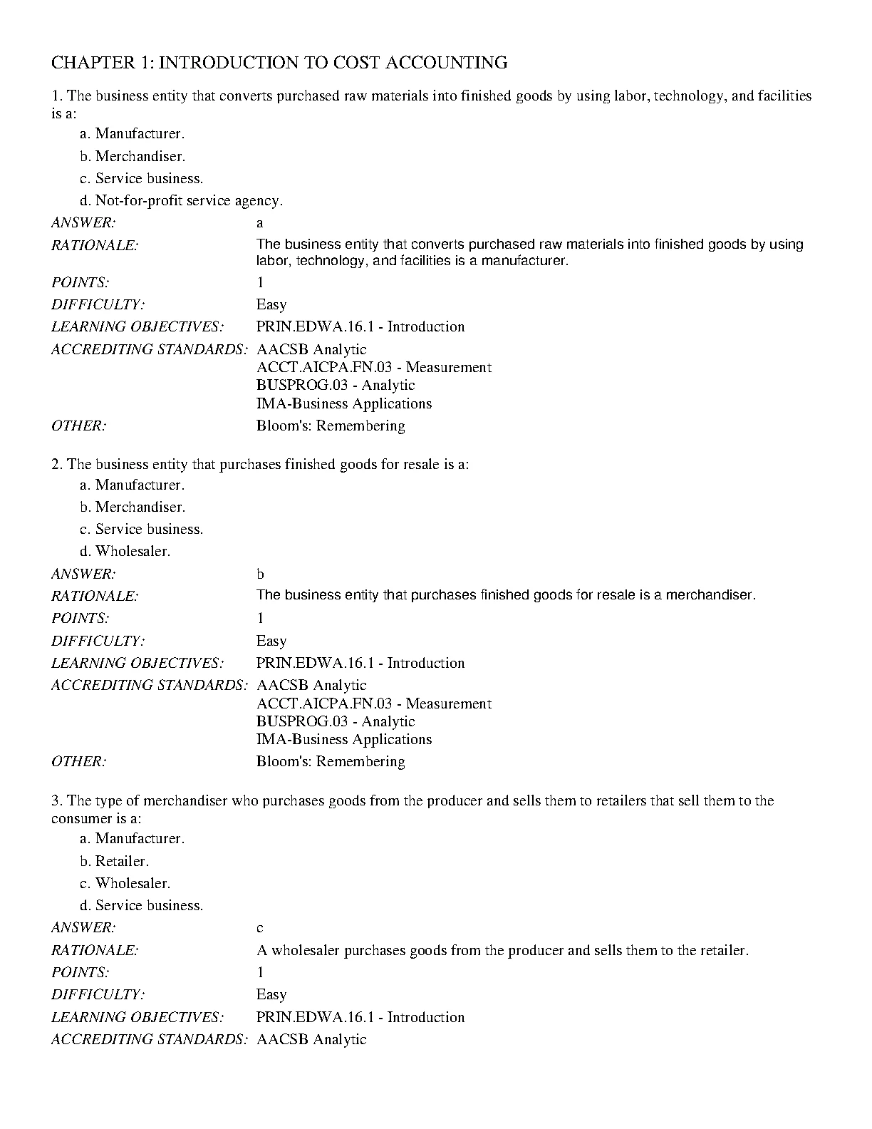 Cost Accounting Test Bank: Introduction to Cost Accounting - Questions and Answers