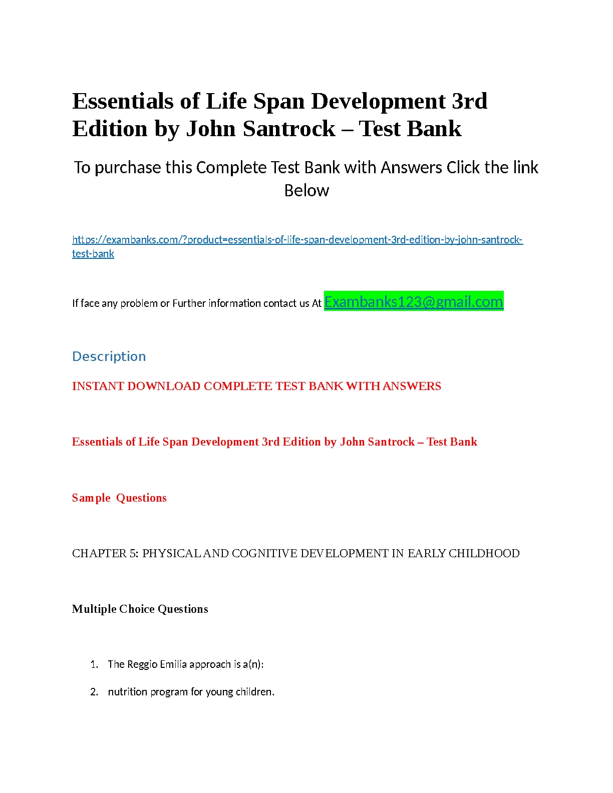 Instant download of the complete test bank with answers for Essentials of Life Span Development, 3rd Edition by John Santrock. This resource is designed to help students master the material and pass their exams on the first try, avoiding costly resits. Prepare effectively for your 2024/2025 academic year!