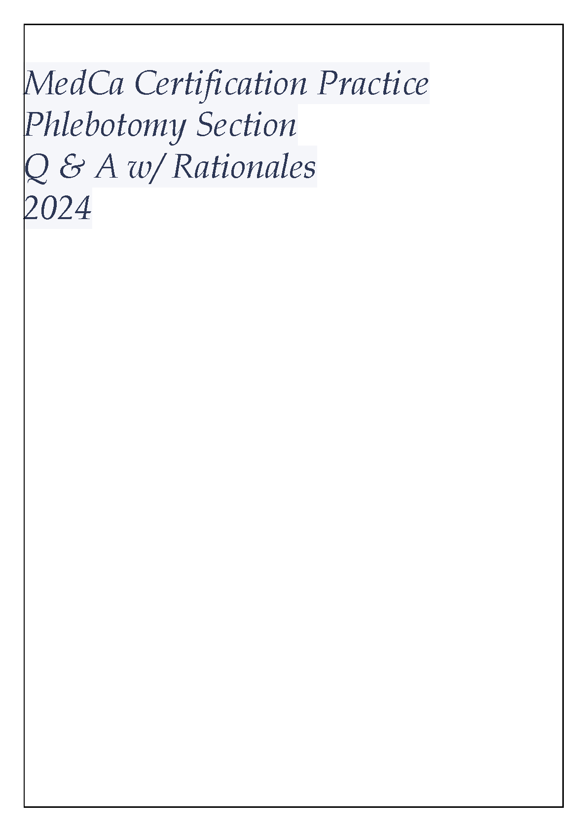 Ace your MedCa Phlebotomy certification exam with this comprehensive 2024 practice question bank. This resource includes questions and answers with detailed rationales, helping you understand the concepts and avoid resits. Designed for the 2024/2025 academic year, this study guide is your key to success.