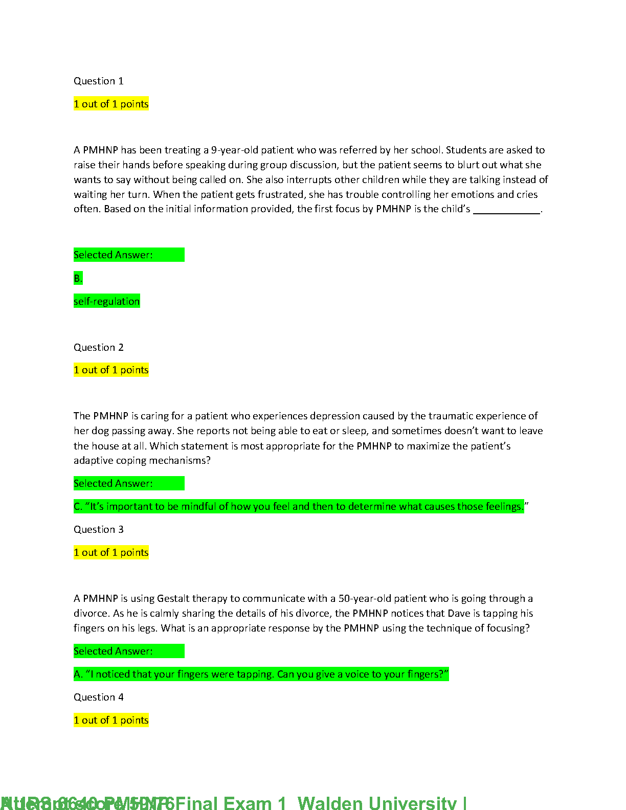 Ace your Walden University PMHNP final exam with this comprehensive resource. This curated collection of practice questions and answers covers key concepts in psychiatric-mental health nursing practice, helping you master self-regulation, coping mechanisms, and Gestalt therapy techniques. Prepare effectively for exam success and avoid resits!