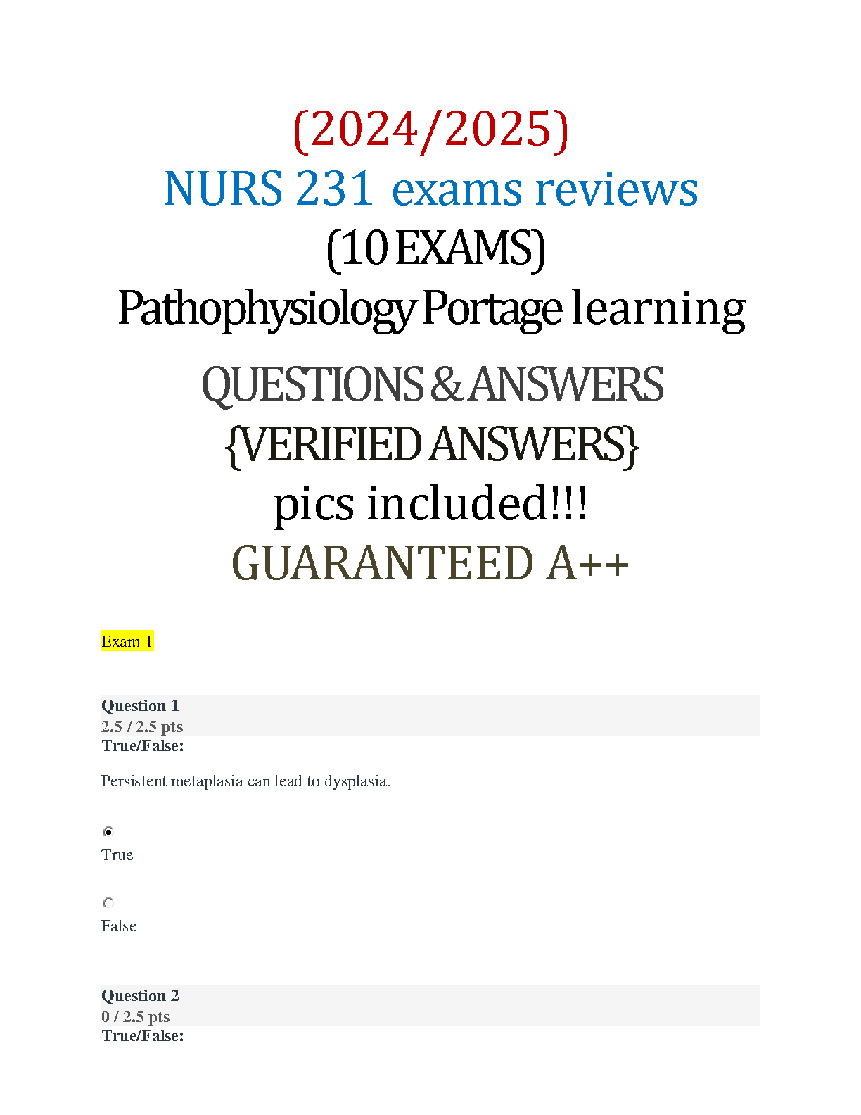 NURS 231 Pathophysiology Portage Learning Exam Reviews (2024/2025): 10 Exams with Verified Answers