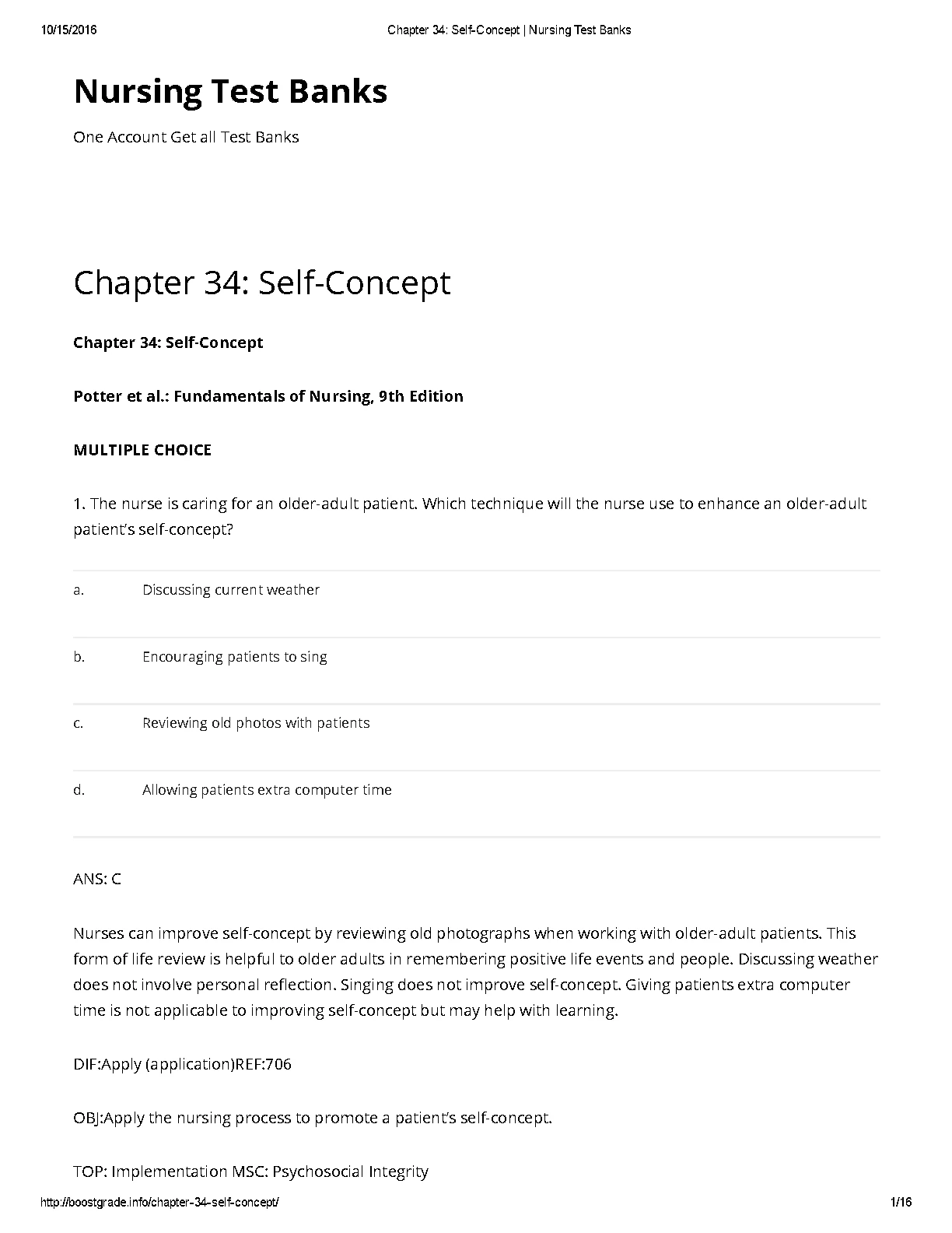 Potter et al. Fundamentals of Nursing 9th Edition Test Bank: Chapter 34 - Self-Concept