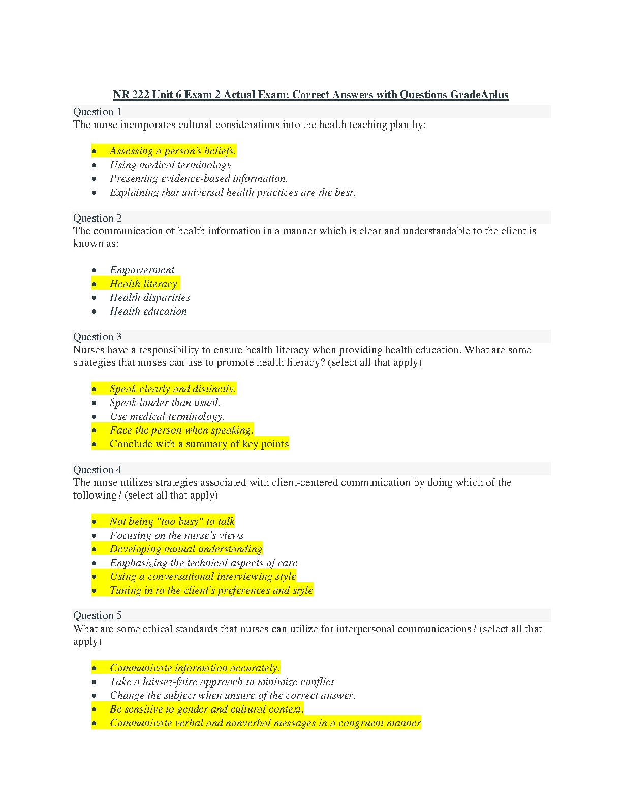 Ace your NR 222 Unit 6 Exam 2 with this comprehensive study guide featuring correct answers and questions. This 2024/2025 edition is designed to help nursing students pass their exams on the first attempt, eliminating the need for resits. Master key concepts related to health literacy, client-centered communication, and ethical standards in nursing.