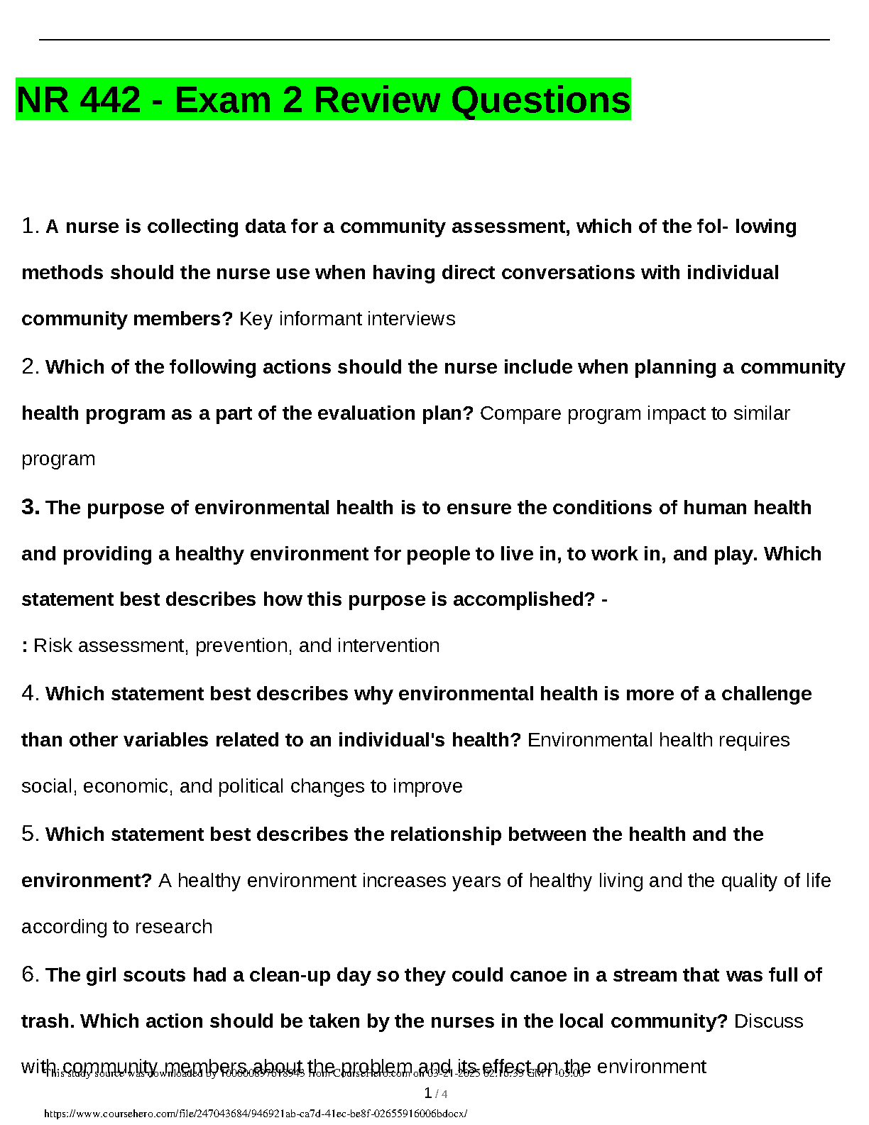 Ace your NR 442 Exam 2 with this essential review guide. This resource features insightful review questions covering key concepts in community health, environmental health, and community assessment. Designed to help students master the material and achieve exam success on their first attempt, this guide is an invaluable tool for nursing students preparing for exams.