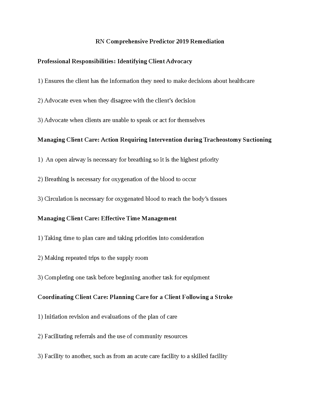 Ace your nursing exams on the first try! This comprehensive remediation guide covers key concepts in client advocacy, tracheostomy suctioning, time management, and stroke care planning. Based on the 2019 RN Comprehensive Predictor, this resource offers focused practice and effective strategies for exam success, ensuring you avoid resits in 2024/2025.