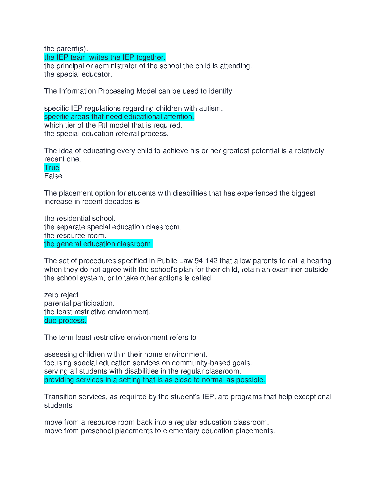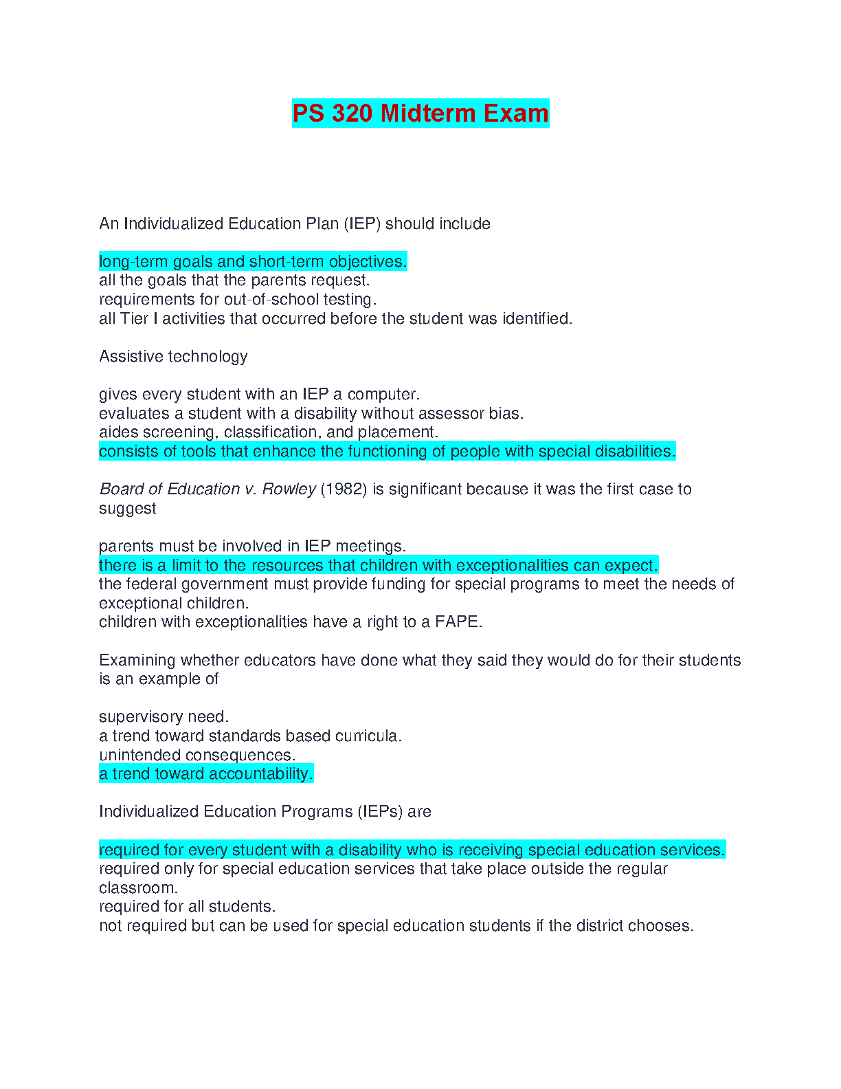 This resource provides a detailed overview of the key concepts covered in the PS 320 Midterm Exam. It is designed to help students understand the material thoroughly, prepare effectively, and achieve their academic goals. Topics include Individualized Education Programs (IEPs), assistive technology, legal cases impacting special education, and accountability in education. Master the concepts and avoid resits!