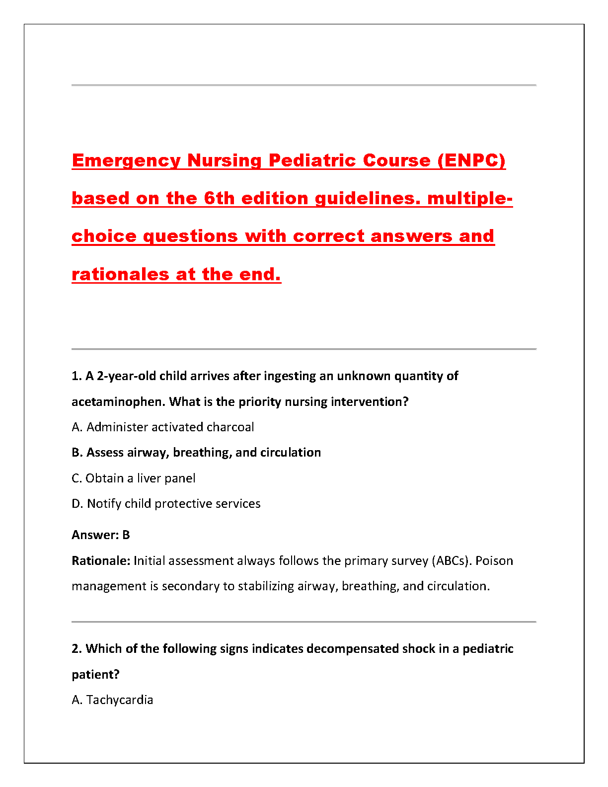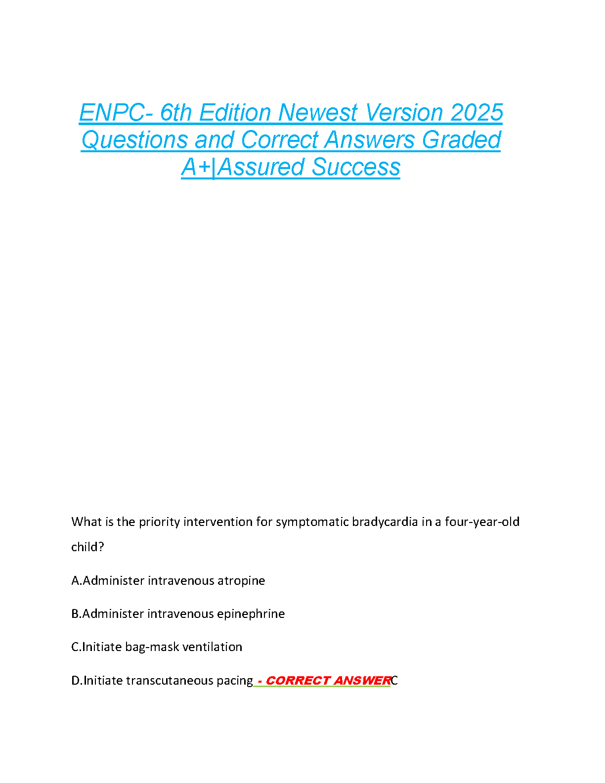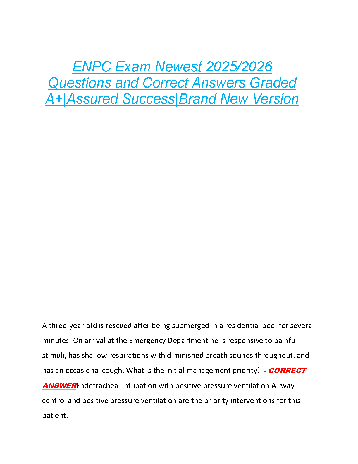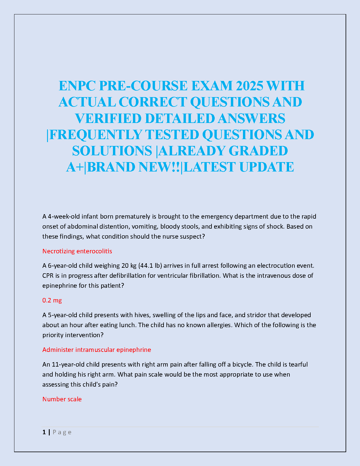 Ace your ENPC exam with this comprehensive study guide featuring 2022 exam answers, rated A+. This resource is designed to help you pass on your first attempt, avoiding costly resits and saving you valuable time. Prepare effectively and confidently for your Emergency Nursing Pediatric Course certification!