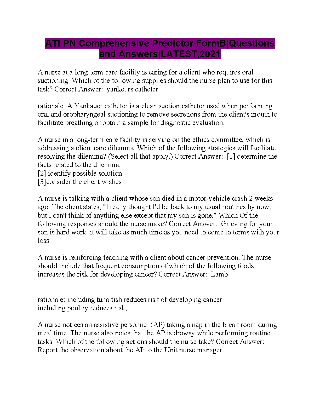 ATI PN Comprehensive Predictor Form B Questions and Answers LATEST SOLUTION 2023