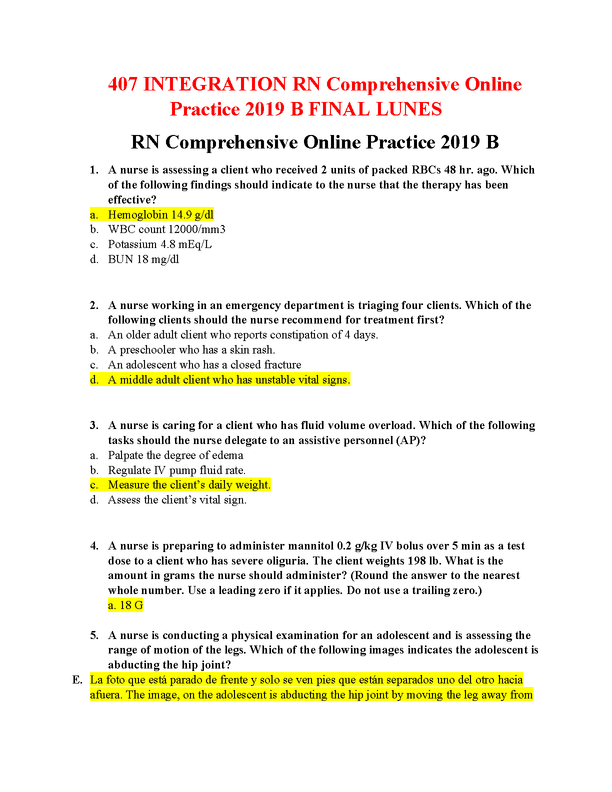 407 INTEGRATION RN Comprehensive Online Practice 2019 B FINAL LUNES LATEST SOLUTION UPDATED VERSION
