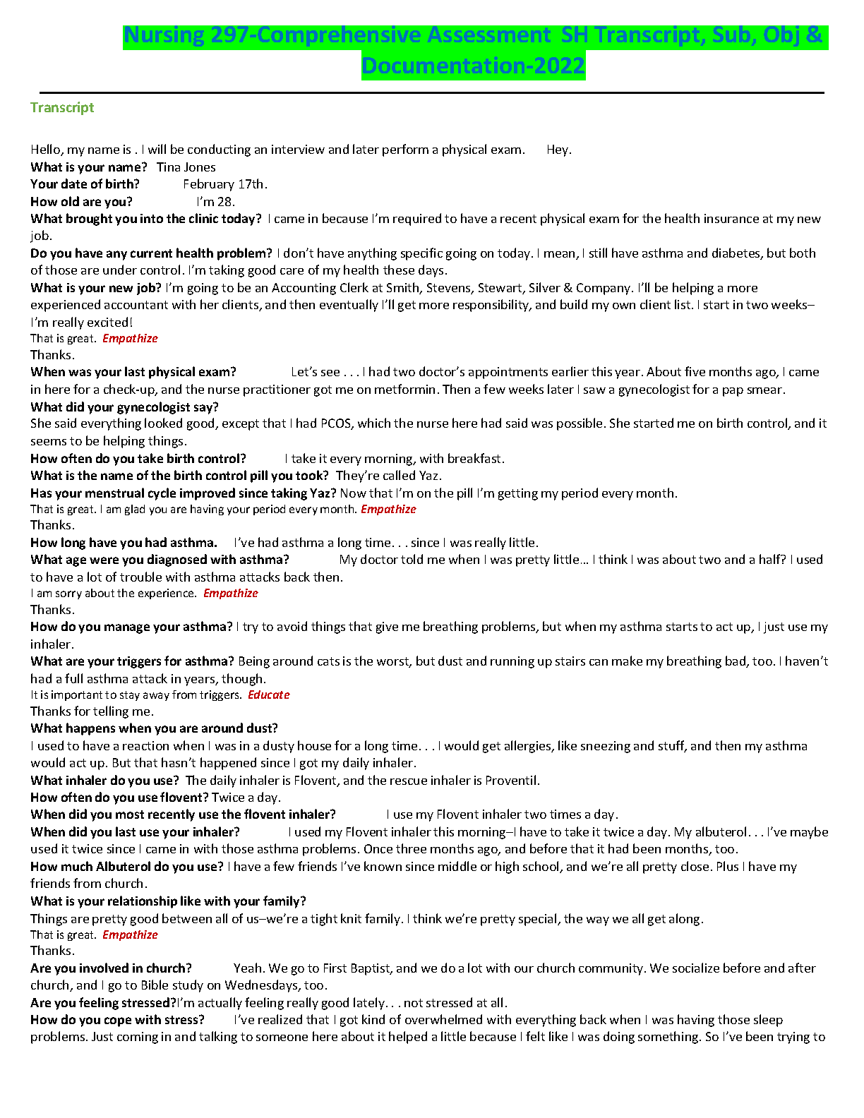 Nursing 297-Comprehensive Assessment SH Transcript, Sub, Obj & Documentation-2022/2023. DOWNLOAD on www.hackedexams.com INSTANTLY.
