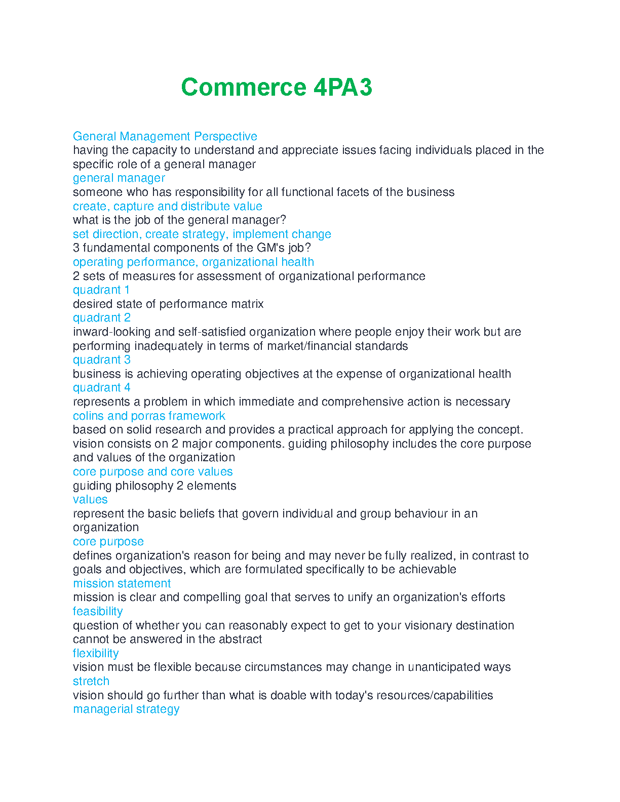 Master the concepts of Commerce 4PA3 with this concise and easy-to-understand guide. Designed to help students ace their exams on the first attempt, this resource covers all essential topics, including general management perspective, Collins and Porras framework, and more. Avoid resits and achieve academic success with our expertly curated materials, perfect for the 2024-2025 academic year.