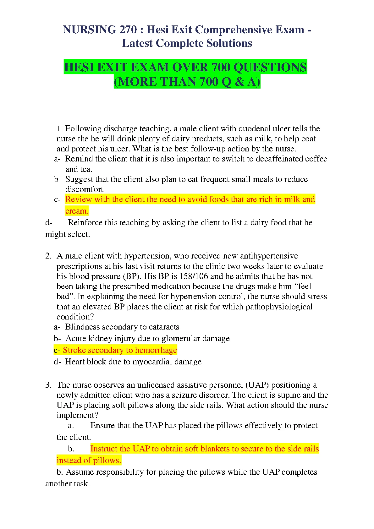 NURSING 270 : Hesi Exit Comprehensive Exam - Latest Complete Solutions HESI EXIT EXAM OVER 700 QUESTIONS (MORE THAN 700 Q & A). DOWNLOAD on www.hackedexams.com INSTANTLY.