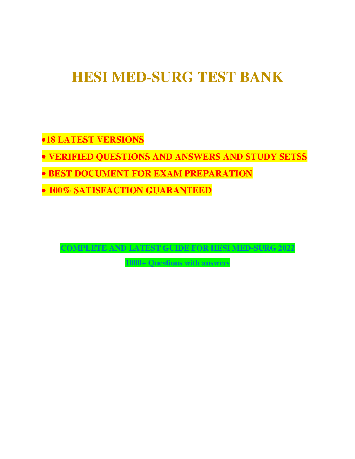 HESI MED-SURG TEST BANK 18 LATEST VERSIONS  VERIFIED QUESTIONS AND ANSWERS AND STUDY SETSS  BEST DOCUMENT FOR EXAM PREPARATION  100% SATISFACTION GUARANTEED