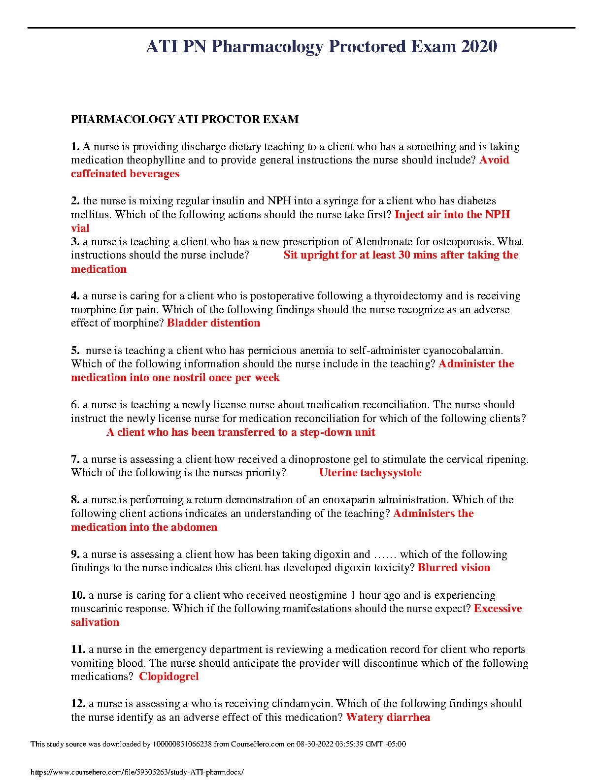 ATI PN Pharmacology Proctored Exam 2020 UPDATED WITH VERIFIED ANSWERS FOR 2023/2024